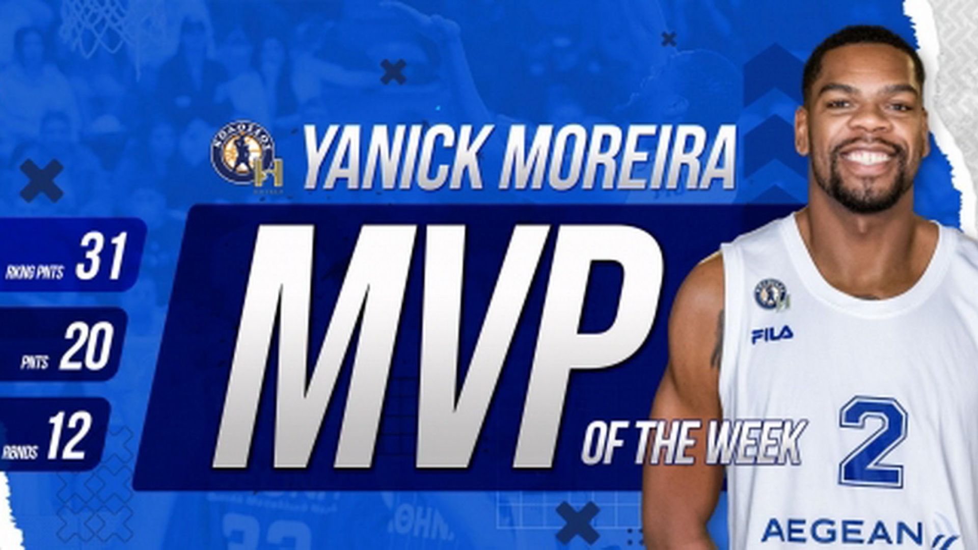 Νέος MVP of the Week είναι ο συμπαίκτης του Κατσίβελη στον Κολοσσό H Hotels Γιανίκ Μορέϊρα! Ο 31χρονος σέντερ από την Ανγκόλα, που έχει αγωνιστεί επίσης στην Basket League με ΠΑΟΚ, ΑΕΚ και Περιστέρι, συγκέντρωσε 31 βαθμούς στο ranking (20 πόντοι με 2/3 βολές, 9/11 δίποντα, 12 ριμπάουντ, 2 ασίστ, ένα κόψιμο, 2 κερδισμένα φάουλ, 4 φάουλ εναντίον και ένα λάθος σε 22’) στην εντός έδρας νίκη των «θαλασσί» επί της Καρδίτσας ΒΙΟΛΟΓΙΚΟ ΧΩΡΙΟ.
