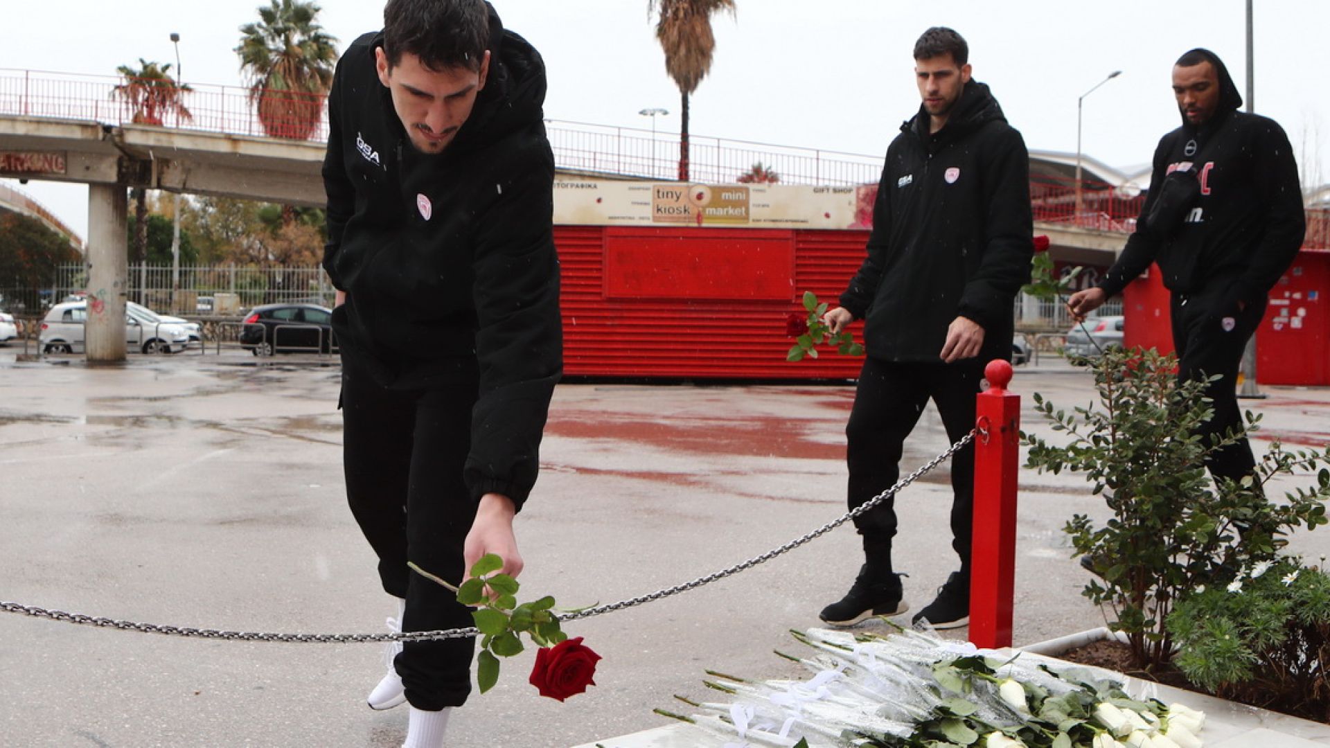 Συγκεκριμένα, η αποστολή των «ερυθρόλευκων», πριν την αναχώρηση της για το Λαύριο και το παιχνίδι απέναντι στην τοπική ομάδα (15:45), πέρασε από το Στάδιο Καραϊσκάκη και το μνημείο για τα θύματα της Θύρας 7, με τον Γιώργο Μπαρτζώκα και τους παίκτες του να αφήνουν από ένα λουλούδι.