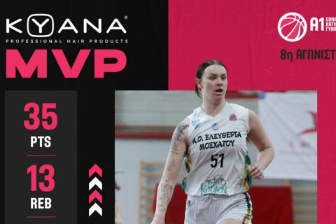 Από τη Ελευθερία Μοσχάτου έρχεται η KYANA MVP για την 8η Αγωνιστική της Α1 Γυναικών. Ο λόγος για την Κέιτλιν Αν Μπικλ, η οποία στην νίκη της ομάδας της με 78-72 επί του Αθηναϊκού τελείωσε την αναμέτρηση με 35 πόντους, 13 ριμπάουντ, 6 ασίστ, 3 τάπες και 45 στο σύστημα αξιολόγησης μετά από 31’42’’ λεπτά συμμετοχής.