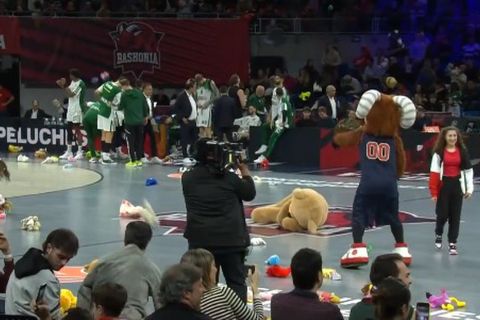 Υπέροχη εικόνα στην «Φερνάντο Μπουέσα Αρίνα», με τους φίλους της Μπασκόνια να πετούν λούτρινε κούκλες στο παρκέ, λίγο πριν από το τζάμπολ της αναμέτρησης με τον Παναθηναϊκό.