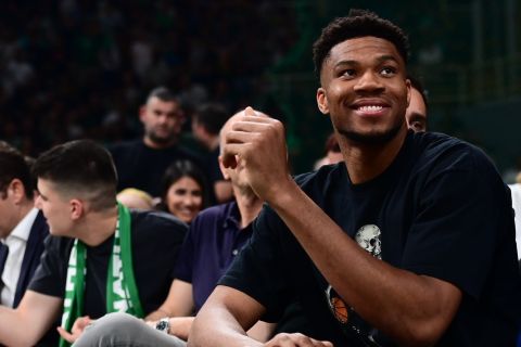 Ο Γιάννης Αντετοκούνμπο βρίσκεται στο κλειστό των Ολυμπιακών Εγκαταστάσεων για να παρακολουθήσει τον πρώτο τελικό της Basket League μεταξύ Παναθηναϊκού και Ολυμπιακού.