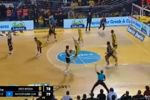 Με το σκορ στο 78-79 και 27'' να απομένουν για την λήξη του αγώνα ο Αρης διαμαρτύρεται σωστά για βήματα του Νούνιες που οδήγησαν σε ασίστ για το 78-81 της Ουλμ, προτού ο Τολιόπουλος με τρίποντο στείλει το ματς στην παράταση (81-81).