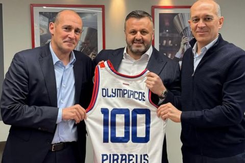 Οι ιδιοκτήτες της ΚΑΕ Ολυμπιακός, Παναγιώτης και Γιώργος Αγγελόπουλος πριν το τζάμπολ μεταξύ της ομάδας τους και του Ερυθρού Αστέρα για την 30η αγωνιστική της Euroleague, συναντ΄ηθηκαν με τον ιδιοκτήτη του σέρβικου συλλόγου, ο οποίος τους χάρισε μια αναμνηστική φανέλα για τα 100 χρόνια των Πειραιωτών.