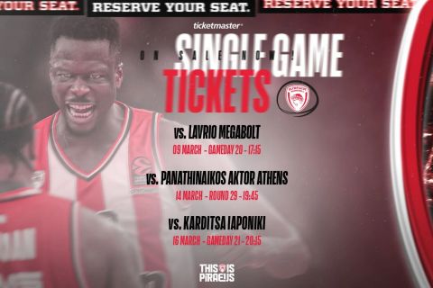 Στη διάθεση του κοινού θα τεθούν τα εισιτήρια όλων των εντός έδρας αγώνων του Ολυμπιακού για τον μήνα Μάρτιο, με το ευρωπαϊκό ντέρμπι με τον Παναθηναϊκό να ξεχωρίζει από το καλεντάρι.