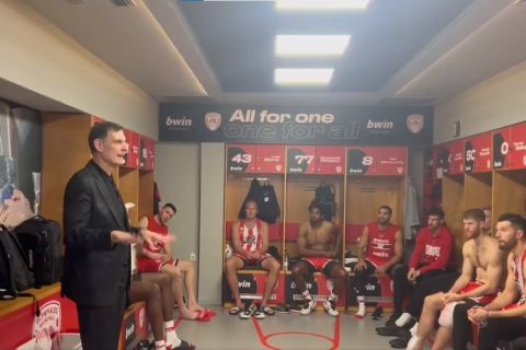 Ο Ολυμπιακός έχει νικήσει την Αρμάνι Μιλάνο με 79-74 και λίγα λεπτά αργότερα ο Γιώργος Μπαρτζώκας αποθεώνει τους παίκτες του στα αποδυτήρια, με τον Έλληνα τεχνικό να εξάρει την προσπάθεια των αθλητών του.