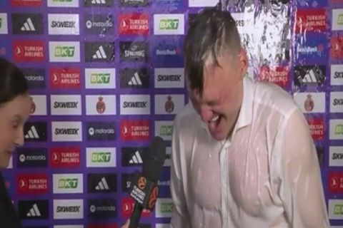 Η Φενέρ πανηγύρισε τεράστιο διπλό πρόκρισης στο Πριγκιπάτο επί της Μονακό και ο Σαρούνας Γιασικεβίτσιους έπεσε "θύμα" μπουγελώματος ενώ έκανε δηλώσεις στο flash interview.
