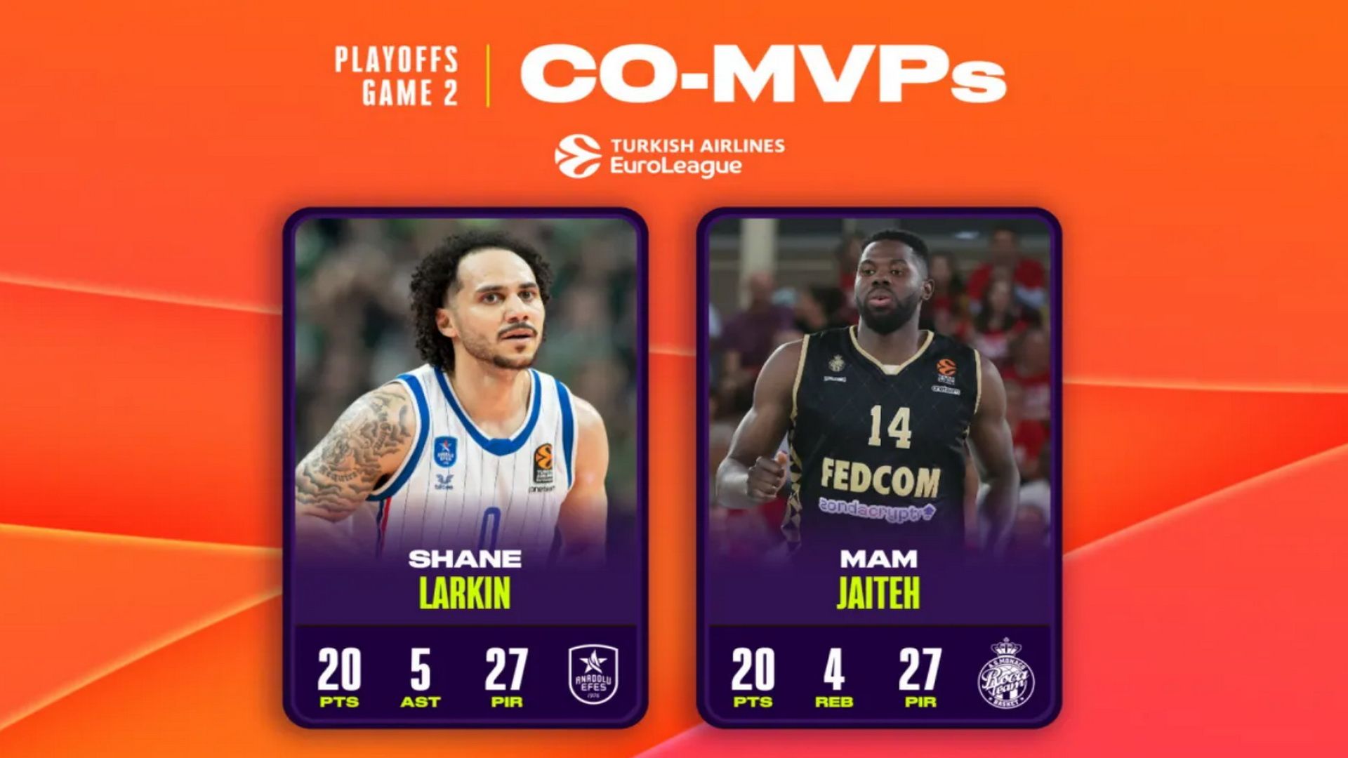 Σέιν Λάρκιν και Μαμ Τζαϊτέ, ξεχώρισαν από τα Game 2 των Play Offs της Euroleague, με τους δύο παίκτες να μοιράζονται το βραβείο του MVP, συγκεντρώνοντας από 27 βαθμούς έκαστος, στο σύστημα αξιολόγησης.