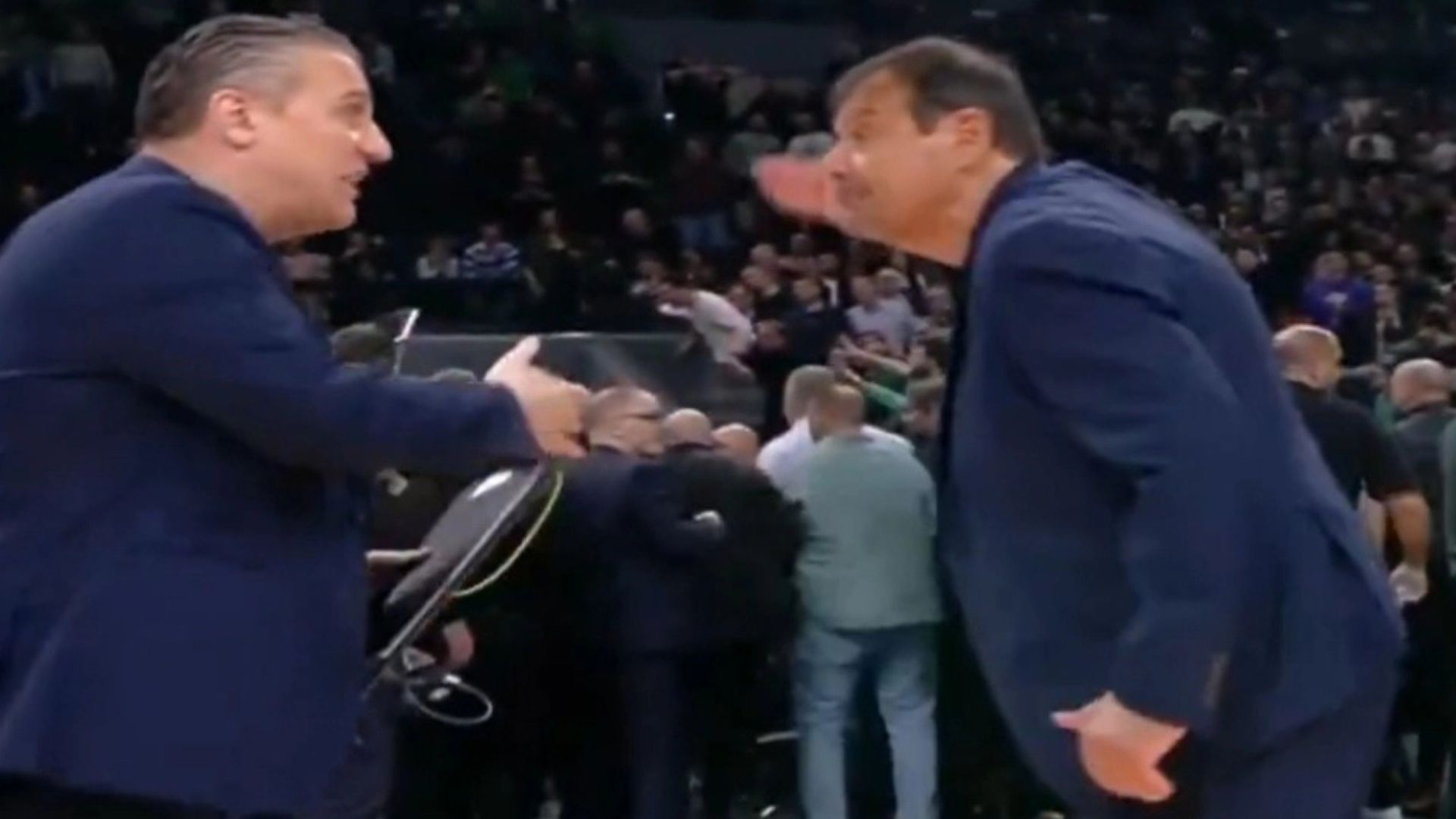 Σκηνές χάους στο κλειστό του ΟΑΚΑ κατά την αποχώρηση των διαιτητών από το παρκέ, καθώς αρκετοί φίλοι του Παναθηναϊκού πήγαν προς τη φυσούνα από όπου θα περνούσαν οι τρεις ρέφερι, βρίζοντάς τους ενώ μερικοί πέταξαν ακόμη και νερά προς το μέρος τους.