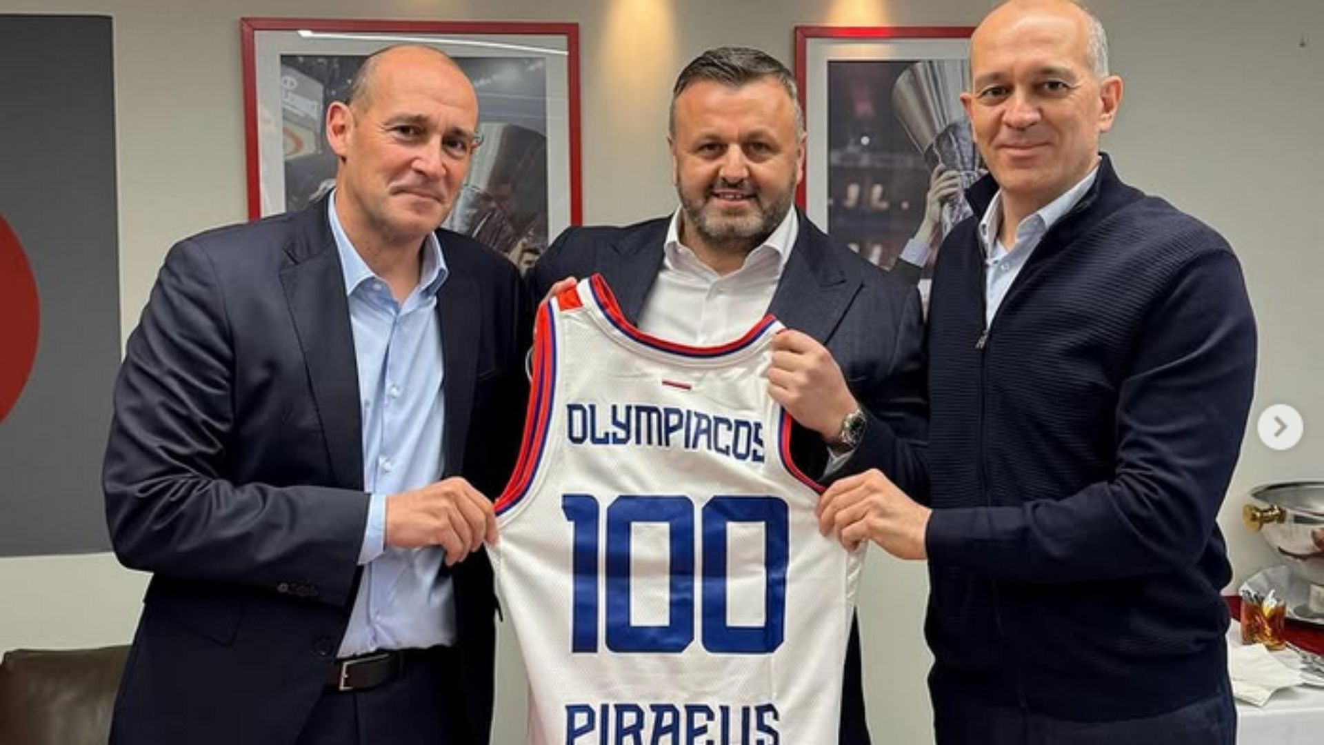 Οι ιδιοκτήτες της ΚΑΕ Ολυμπιακός, Παναγιώτης και Γιώργος Αγγελόπουλος πριν το τζάμπολ μεταξύ της ομάδας τους και του Ερυθρού Αστέρα για την 30η αγωνιστική της Euroleague, συναντ΄ηθηκαν με τον ιδιοκτήτη του σέρβικου συλλόγου, ο οποίος τους χάρισε μια αναμνηστική φανέλα για τα 100 χρόνια των Πειραιωτών.