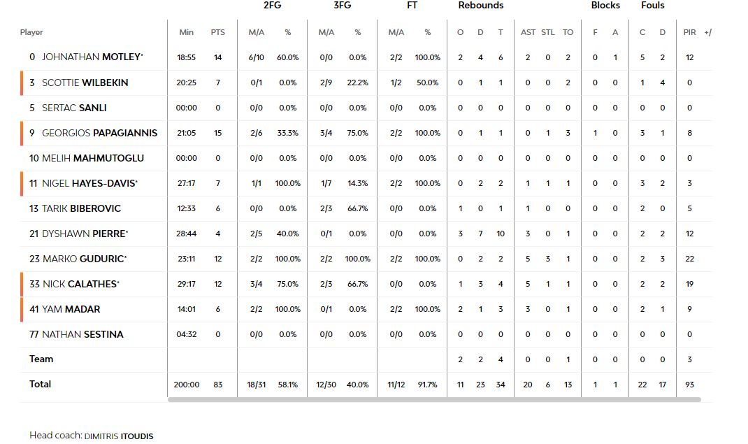 Από την Φενέρμπαχτσε διακρίθηκαν οι Παπαγιάννης και Μότλει με 15 και 14 πόντους αντίστοιχα, με τον Καλάθη και Γκούντουριτς να βάζουν από δώδεκα πόντους έκαστος, ενώ ακολούθησαν οι Χέις και Γουίλμπεκιν με επτά πόντους. Από τον Παναθηναικό ξεχώρισαν οι Λεσόρ και Γκάι με 19 και 13 πόντους.