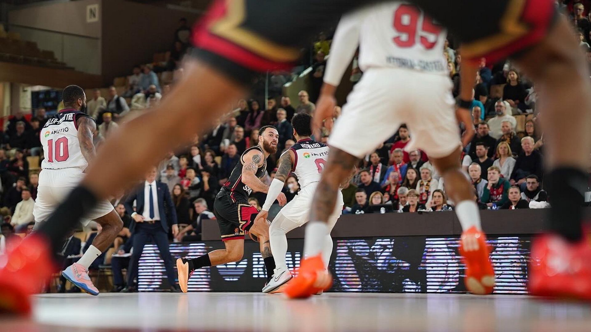 Η Μονακό ξεκίνησε με ένα 5-0, όμως η Μπασκόνια απάντησε με ένα 0-6 για το 5-6 και από εκεί και μετά είχαμε… μάχη. Οι δύο ομάδες εναλλάσσονταν στο σκορ, με τους Χάουαρντ και Μαρίνκοβιτς να πετυχαίνουν το 19-22, προτού ο Τζαϊτέ διαμορφώσει το 21-22, σκορ με το οποίο ολοκληρώθηκε το πρώτο δεκάλεπτο. Η μάχη συνεχίστηκε και στο δεύτερο δεκάλεπτο, όπως δείχνει το 29-29 του 13’. Δύο συνεχόμενα τρίποντα του Χάουαρντ έδωσαν… αέρα έξι πόντων στους Βάσκους (29-35), όμως η Μονακό, με τους Τζέιμς και Ντιαλό, έτρεξε ένα σερί 12-0 που την έφερε μπροστά στο σκορ (41-35), προβάδισμα που οι Μονεγάσκοι διατήρησαν μέχρι το φινάλε του ημιχρόνου (43-39).