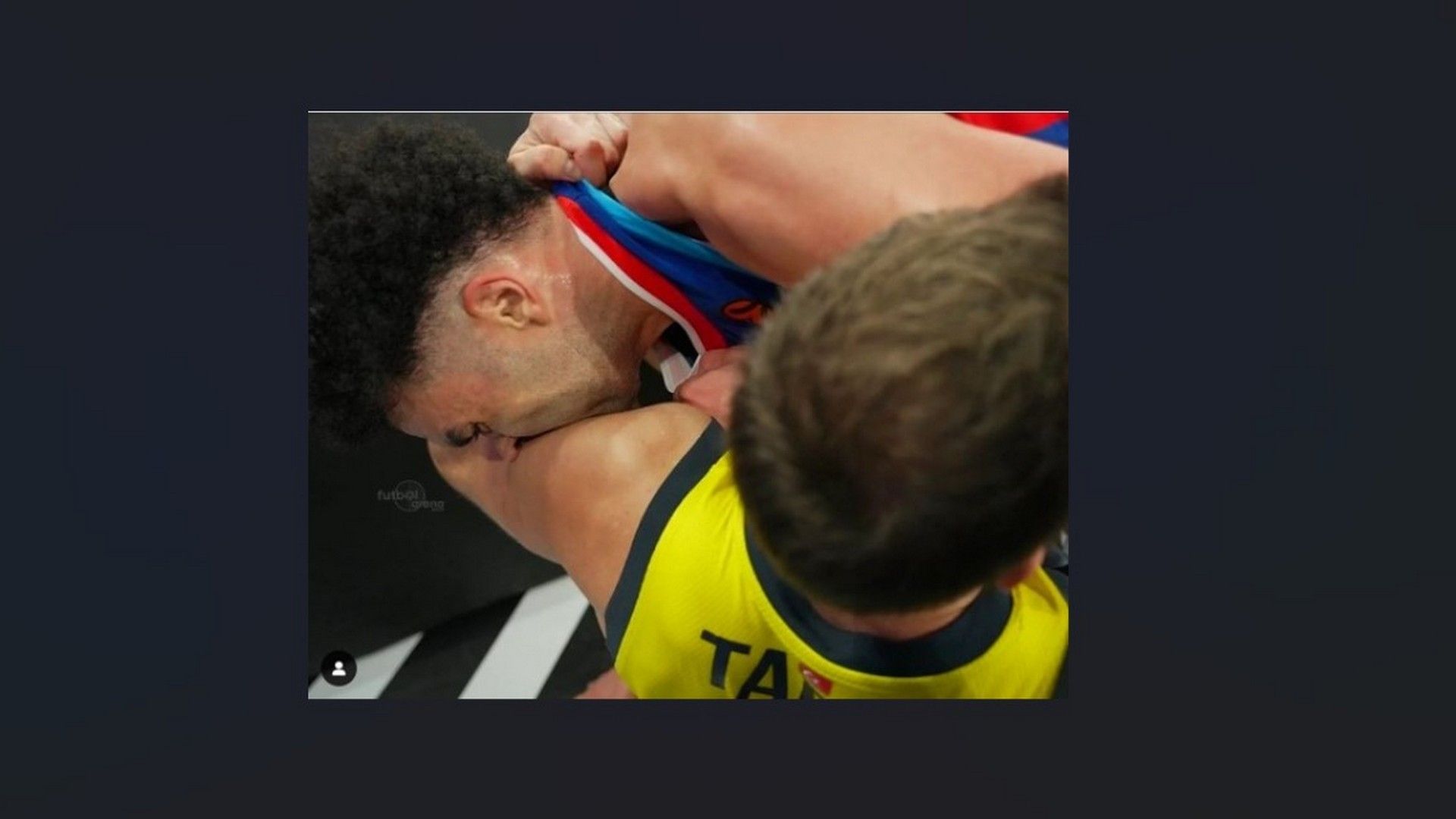 Προσπάθησα να σηκωθώ ξανά από πάνω του και εκείνος ανταπέδωσε κλωτσώντας και αφήνοντας μελανιές στο χέρι μου. Θέλω να είμαι ξεκάθαρος ότι δεν τον δάγκωσα — οι ενέργειές μου ήταν αυστηρά για να σηκωθώ. Το να πιάσεις κάποιον από το κεφάλι ή το λαιμό και να τον τραβήξεις στο έδαφος δεν έχει θέση στο μπάσκετ».