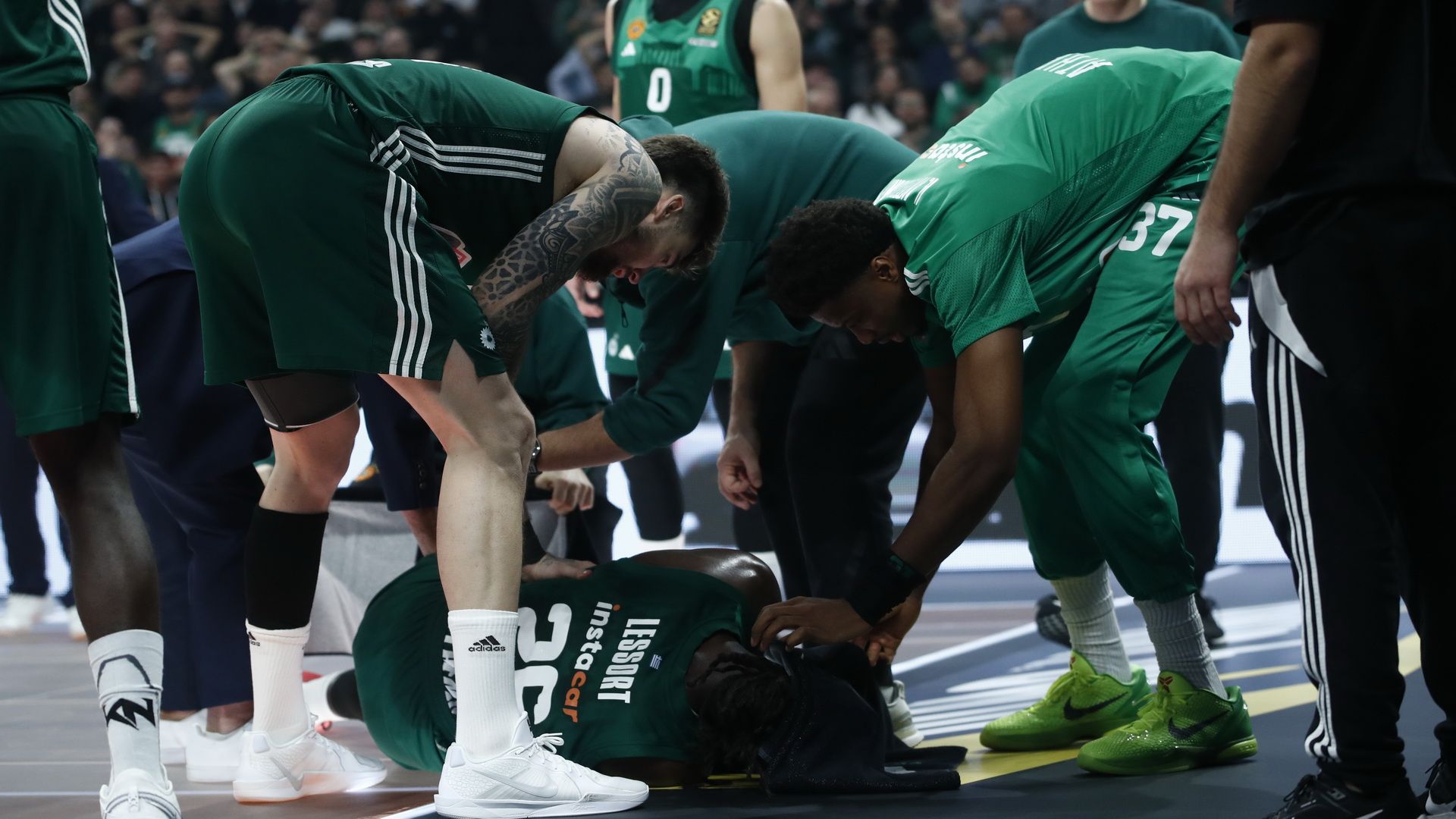 Συγκεκριμένα, μόλις 62’’ μετά την έναρξη της τρίτης περιόδου, ο Γάλλος σέντερ γύρισε το πόδι του και έπεσε στο έδαφος, με τον «πράσινο» σέντερ να δείχνει να υποφέρει και τους παίκτες, τόσο του Παναθηναϊκού όσο και της Μπασκόνια, να πιάνουν το κεφάλι τους.