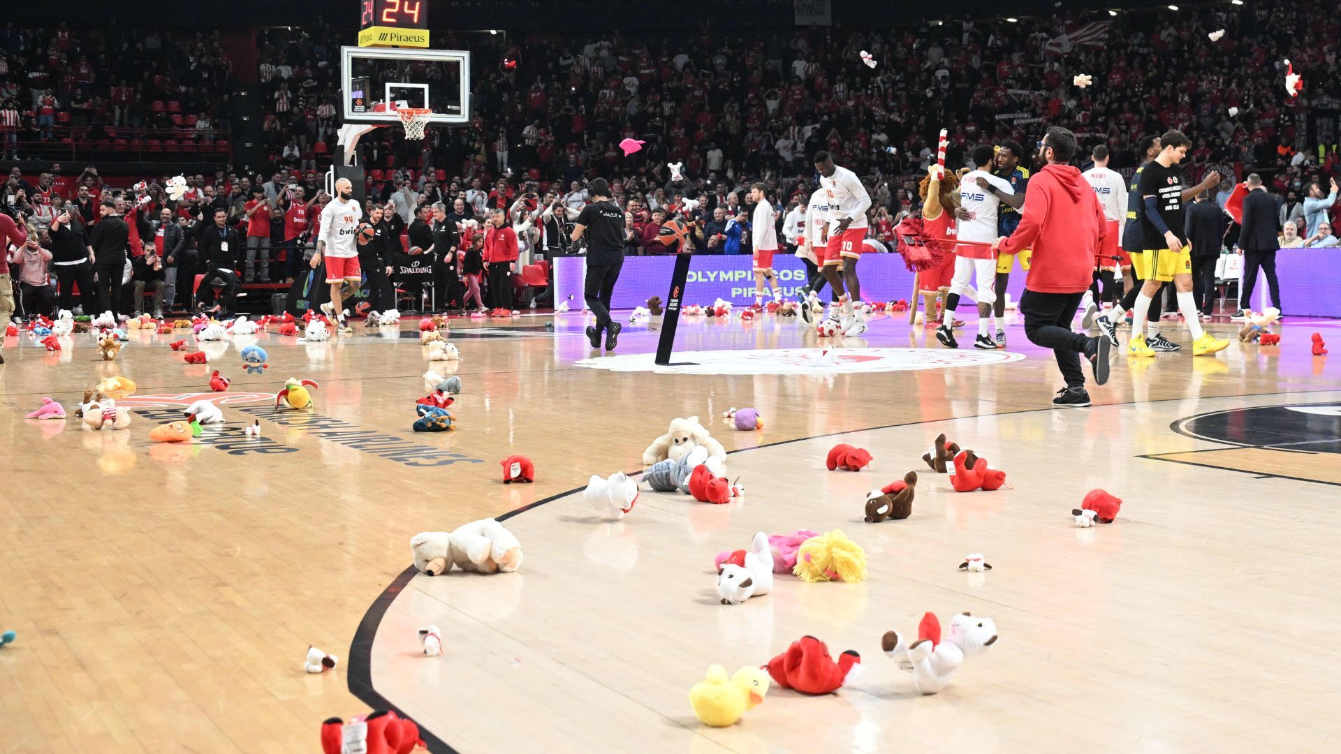 Ολυμπιακός-Φενέρμπαχτσε: Εκατοντάδες αρκουδάκια κάλυψαν το παρκέ του ΣΕΦ για καλό σκοπό (vid)