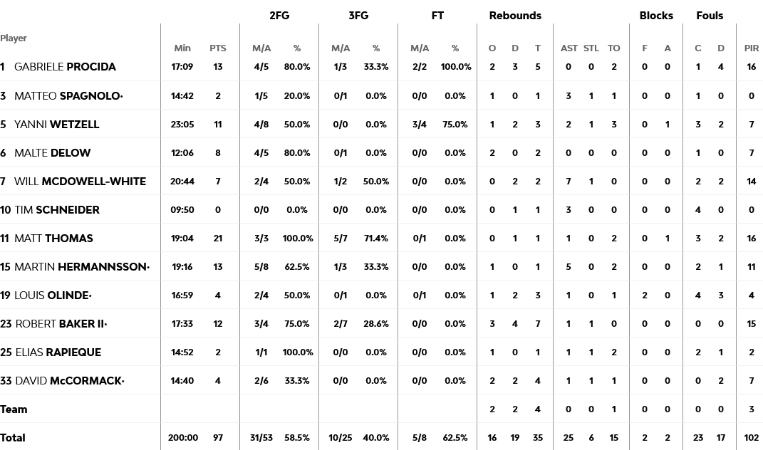Εξαιρετικός ο Ματ Τόμας με 21 πόντους και 5/7 τρίποντα, με τους Χέρμανσον και Προσίντα να έχουν από 13 πόντους έκαστος, ενώ για την Μπασκόνια, ο Ρογκαβόπουλος ήταν ο πρώτος σκόρερ της ομάδας του με 17 πόντους, με τον Χάουαρντ να έχει 15.