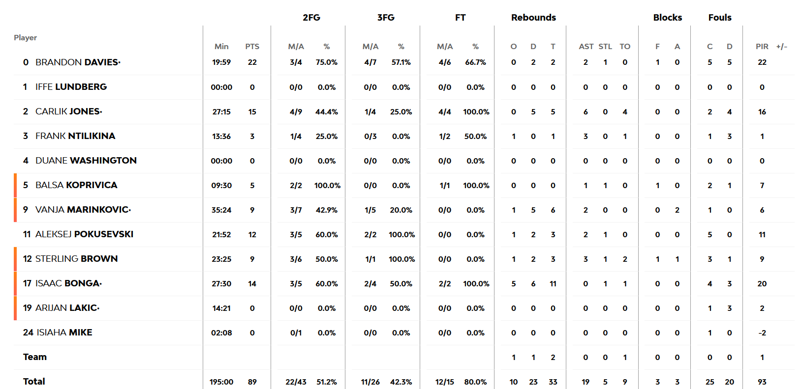 Από τους νικητές ξεχώρισε ο Ντζάναν Μούσα με 15 πόντους, ο Γουόλτερ Ταβάρες με 4 πόντους και 6 ριμπάουντ, καθώς και ο Ιμπάκα με 11 πόντους και 10 ριμπάουντ. Από την άλλη, πολύ καλή επίδοση από την Παρτιζάν σημείωσε ο Μπράντον Ντέιβις με 22 πόντους και ο Ιζαάκ Μπόνγκα με 14 πόντους και 11 ριμπάουντ.