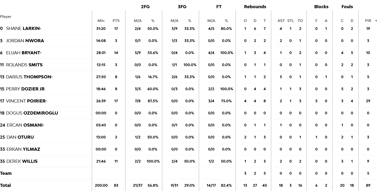 Ξεχώρισαν: Από πλευράς πρασίνων ο Γιούρτσεβεν με 14 πόντους και 7 ριμπάουτ, ενώ από τους Τούρκους οι Λάρκιν και Πουαριέ με 17 πόντους αντιστοίχως.