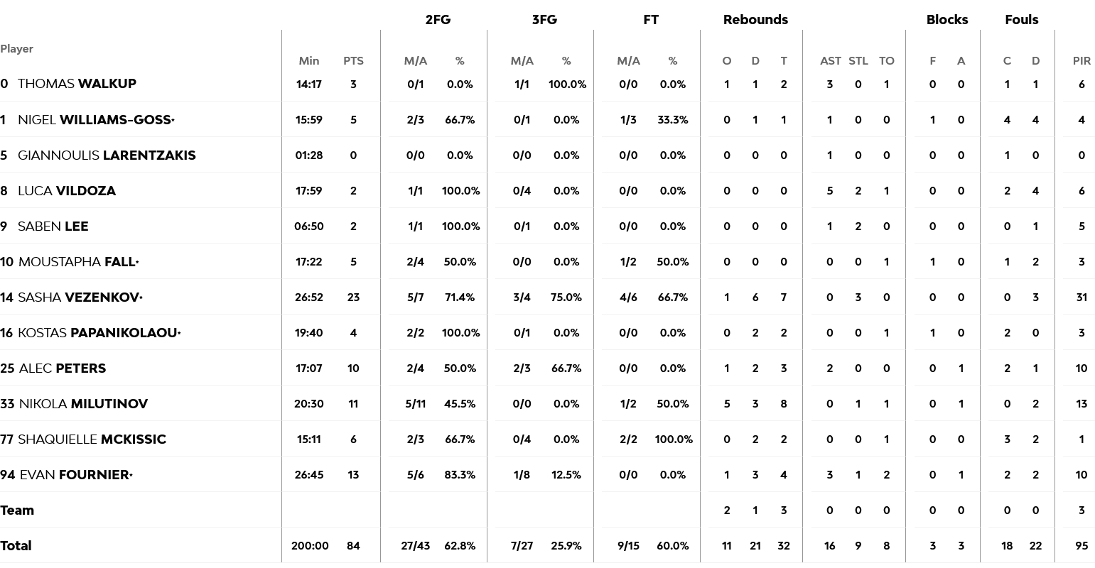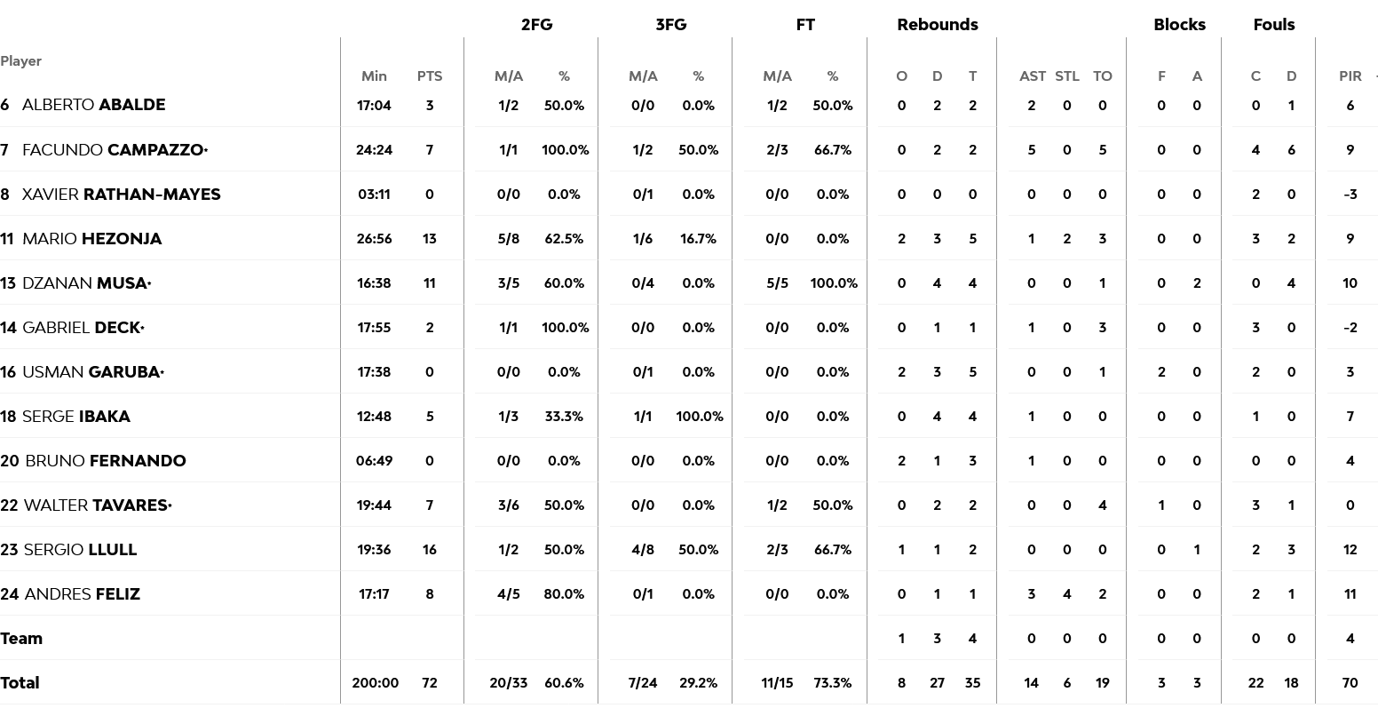 Ξεχώρισαν: 13 πόντοι ήταν ο απολογισμός του Εβάν Φουρνιέ, με τον Μιλουτίνοβ να έχει 11 πόντους και οκτώ ριμπάουντ και τον Πίτερς 10 πόντους. Για την Ρεάλ, ο…αγέραστος Γιουλ είχε 16 πόντους, με τον Χεζόνια να ακολουθεί με 13 και τον Μούσα με 11 πόντους.