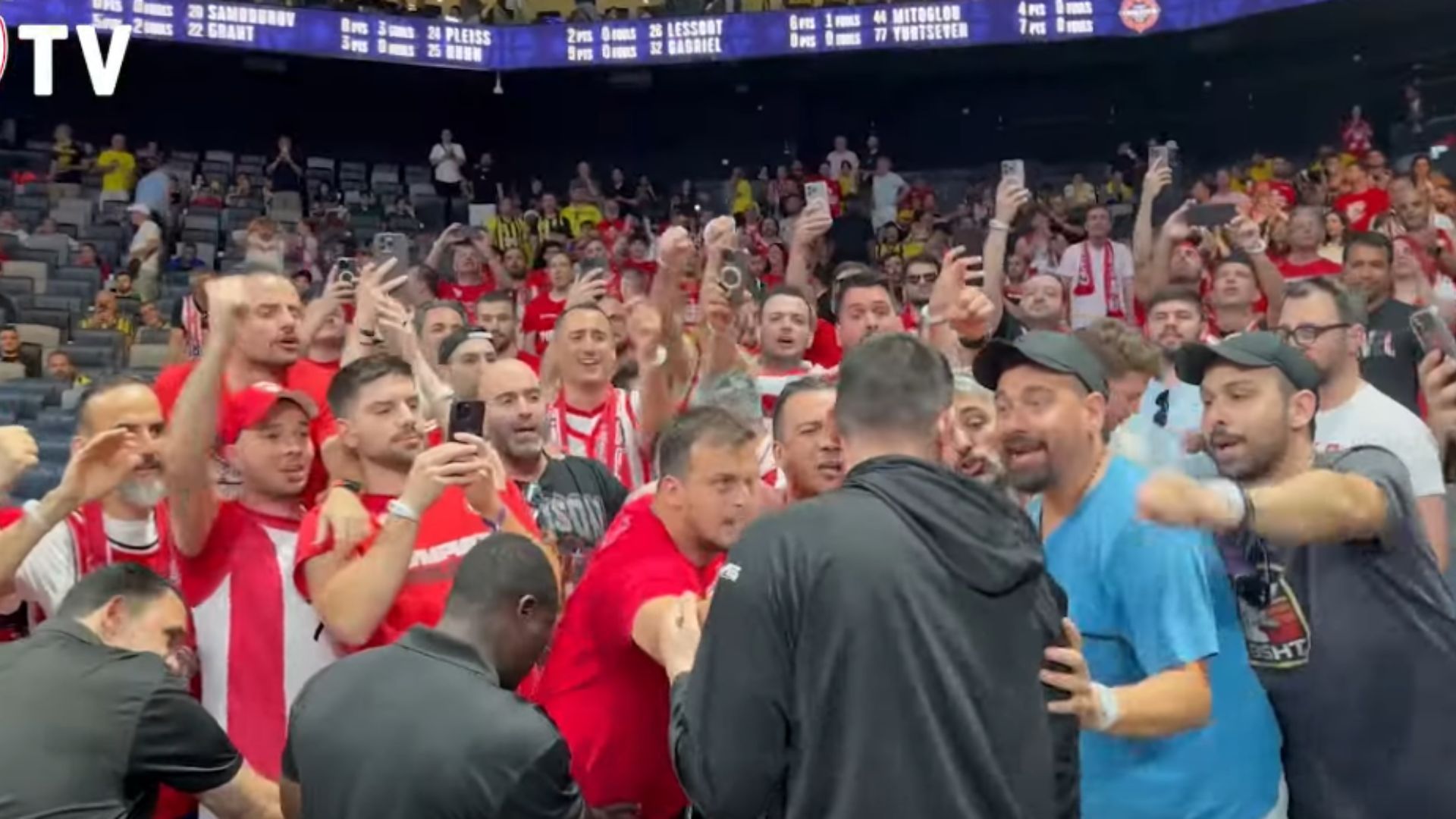 Η θερμή «ερυθρόλευκη» κερκίδα, η μάχη με τους «πράσινους» και οι αγκαλιές του Παπανικολάου με τον κόσμο του Ολυμπιακού (vid)