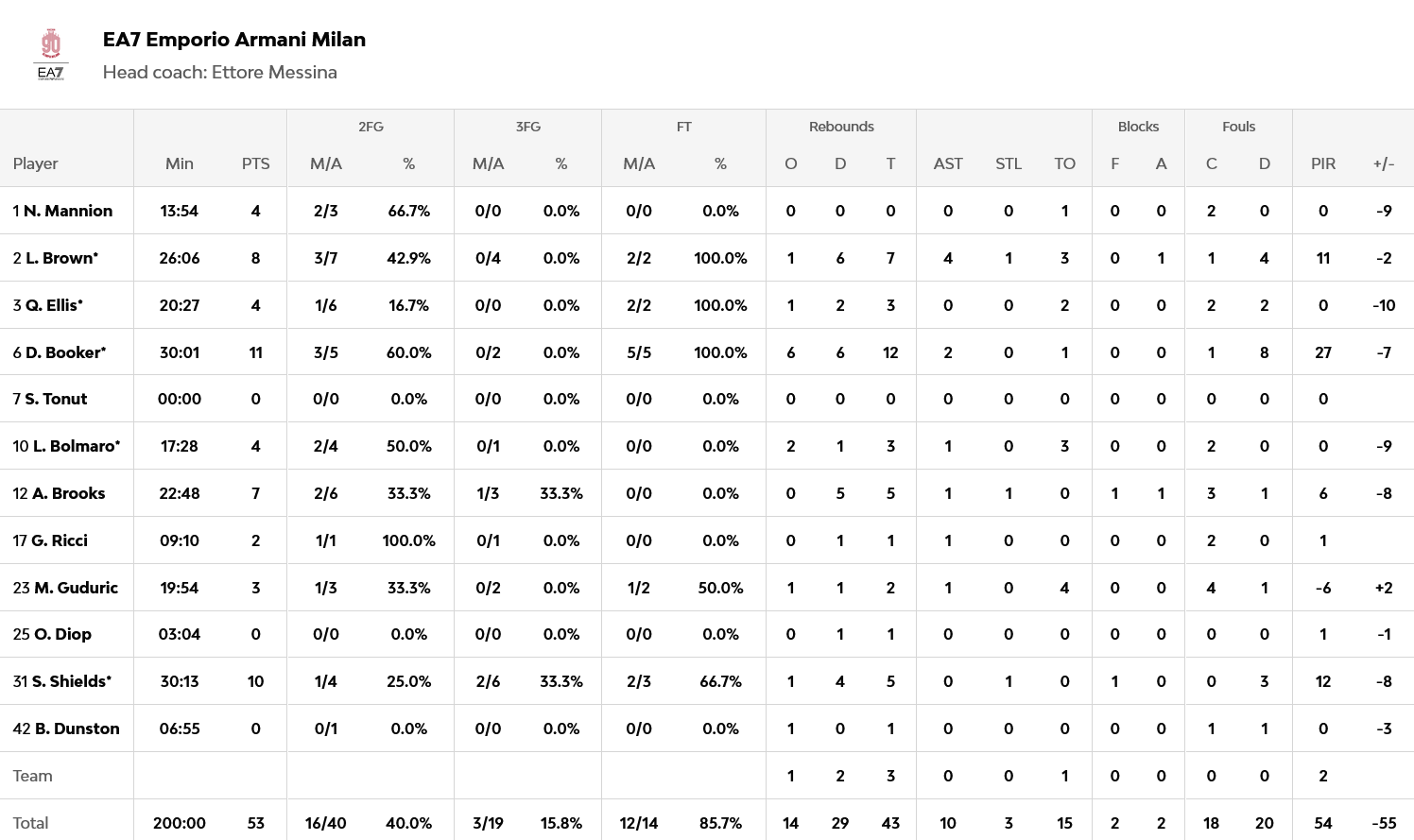 Λουτσιτς με 15 πόντους, Ομπστ με 14 και Μπάλντγουιν με 11, ήταν οι κορυφαίοι για τους νικητές, ενώ για την Αρμάνι, ο Μπούκερ είχε 11 πόντους και 12 ριμπάουντ.