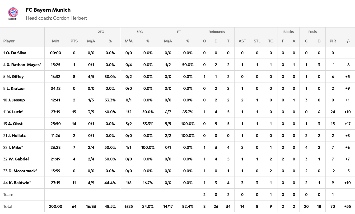 Οι φιλοξενούμενοι έδειχναν να πατάνε καλύτερα στο πρώτο ημίχρονο, το οποίο έκλεισαν στο +5 (28-33). Στο β’ μέρος, όμως, η άμυνα των Βαυαρών έκλεισε σαν… μέγγενη, επιτρέποντας στην Αρμάνι να πετύχει μόλις 20 πόντους, με την Μπάγερν να φτάνει στην νίκη με 64-53.