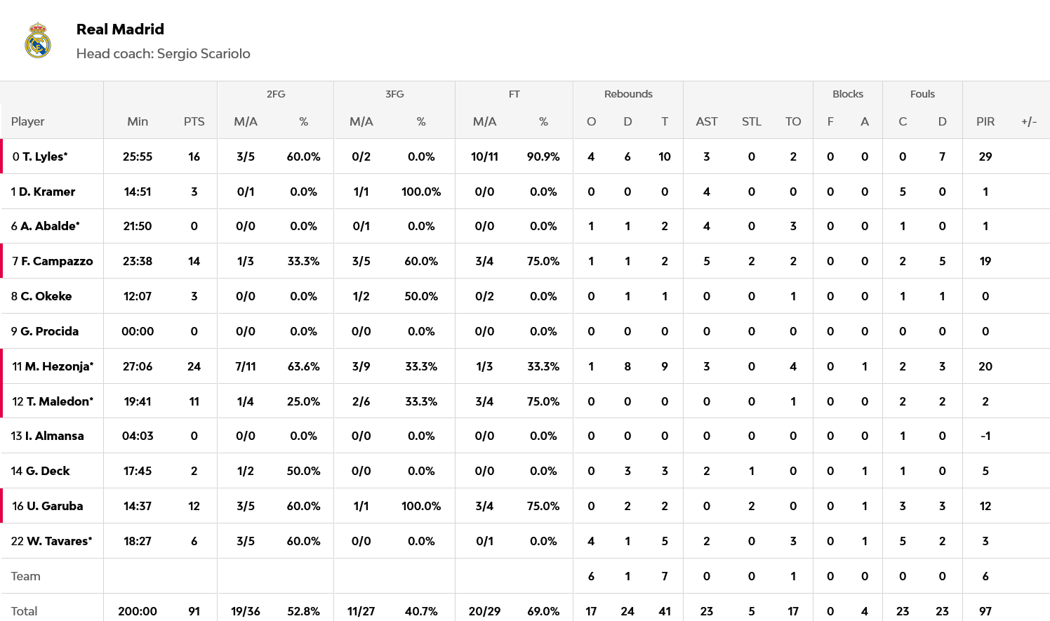 Για την Ρεάλ, που βρέθηκε 4’’ μακριά από το πρώτο φετινό της «διπλό» στην Euroleague, ο Χεζόνια είχε 24 πόντους και εννέα ριμπάουντ, με τον Λάιλς να κάνει double – double με 16 πόντους και 10 ριμπάουντ και τον Καμπάτσο να προσθέτει 14.