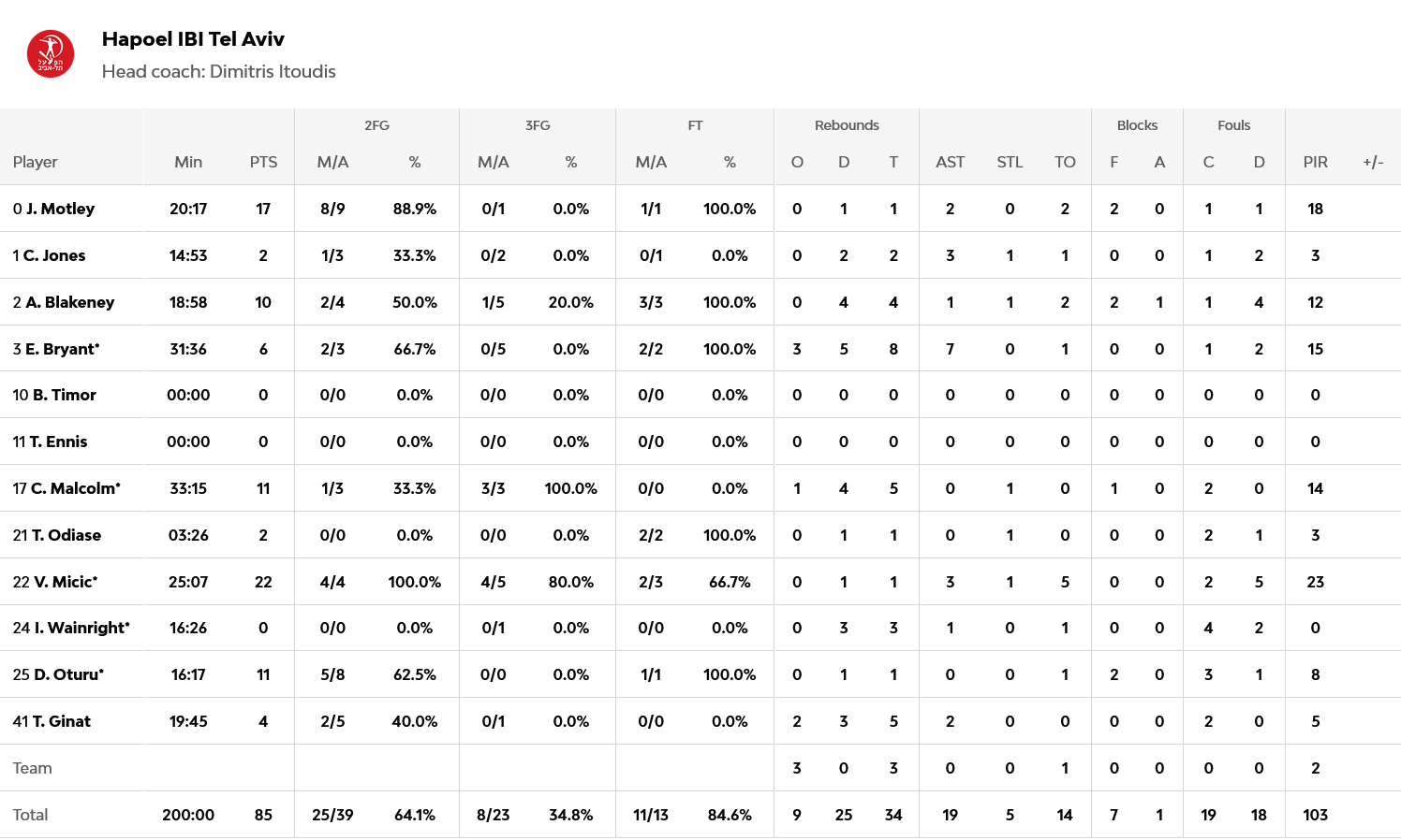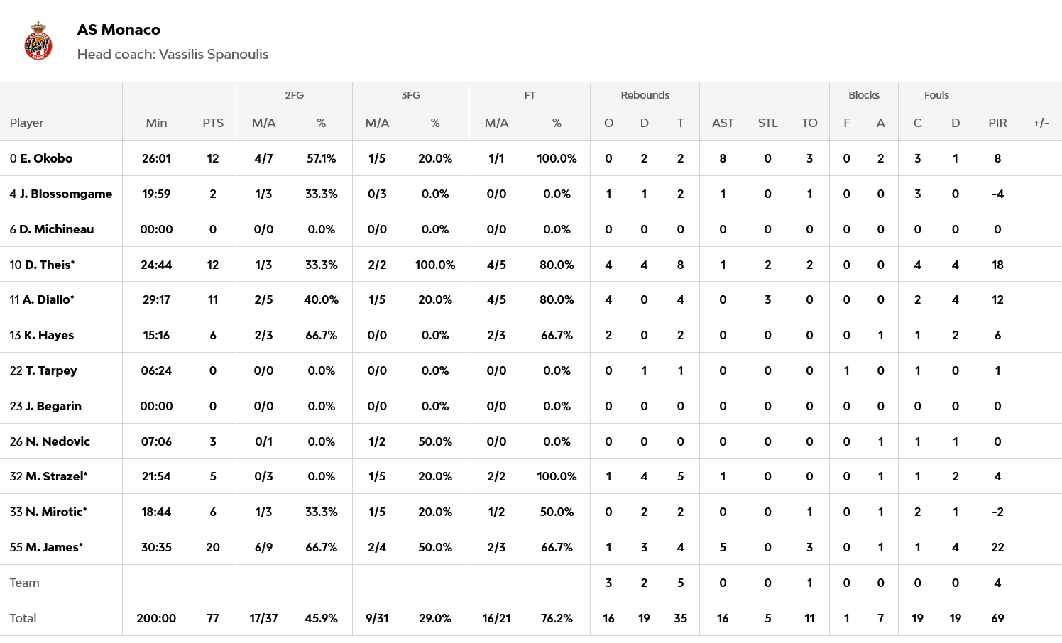 Από την Χάποελ Τελ Αβίβ διακρίθηκαν οι Μίτσιτς και Μότλει με 22 και 17 πόντους αντίστοιχα. Από την Μονακό ξεχώρισε ο Τζέιμς με 20 πόντους, με τους Οκόμπο και Τάις να σκοράρουν από 12 πόντους έκαστος.