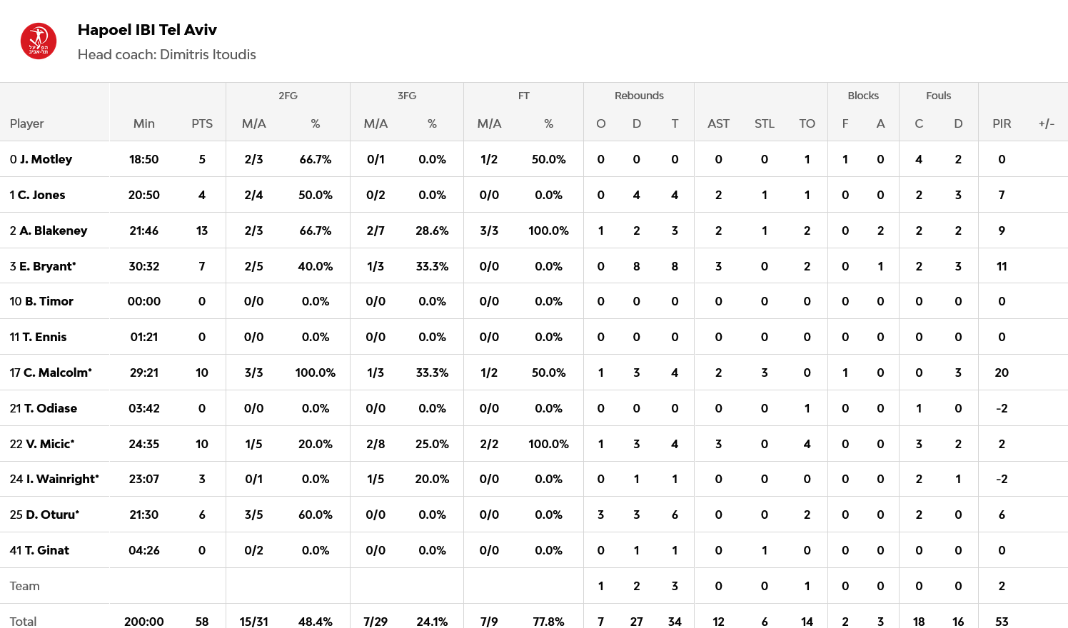 Ξεχώρισαν: Ο Βεζένκοβ με 14 πόντους ήταν ο πρώτος σκόρερ της αναμέτρησης, με τον Ντόρσεϊ να έχει 11. Για την Χάποελ, 13 πόντους πέτυχε ο Μπλέικνι και από 10 οι Μίτσιτς και Μάλκολμ.