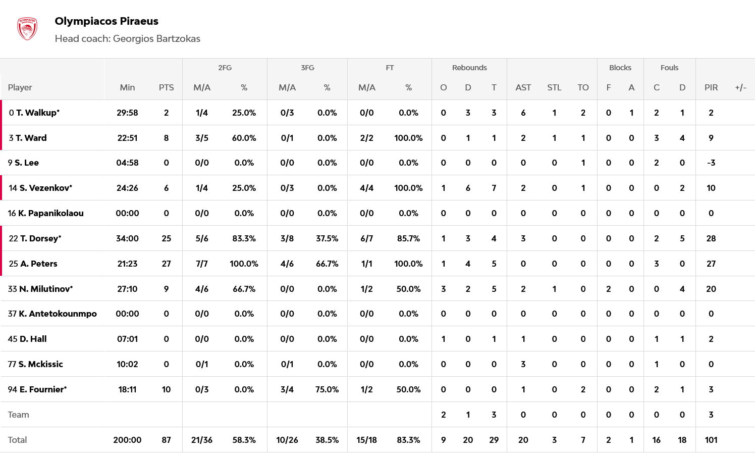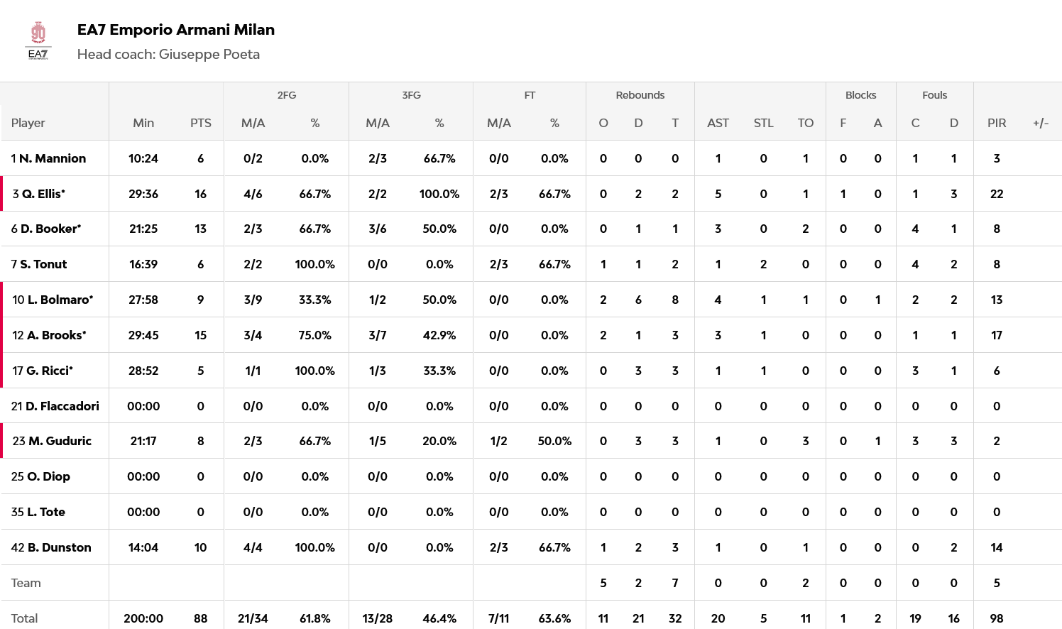Ξεχώρισαν: Ο Ντόρσεϊ σταμάτησε στους 25 πόντους, ενώ ο Φουρνιέ πέτυχε 10. Για την Αρμάνι, ο Έλις… σκότωσε τον Ολυμπιακό με 16 πόντους και δύο καθοριστικά τρίποντα, με τον Μπρουκς να έχει 15 πόντους και τον Μπούκερ 13.