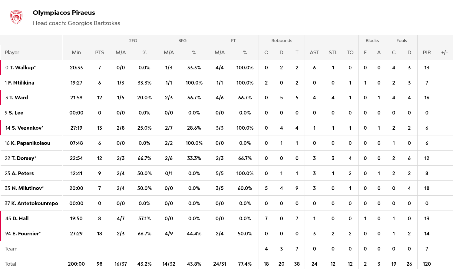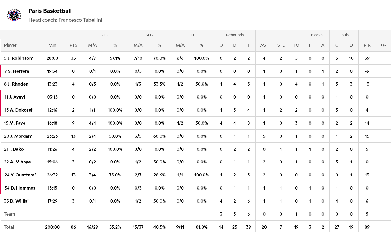 Ξεχώρισαν: 13 πόντους πέτυχε ο Βεζένκοβ, ενώ από 12 πόντους είχαν Ντόρσεϊ και Γουόρντ, με τον Αμερικανό φόργουορντ να είναι εξαιρετικός, με πέντε ριμπάουντ, τέσσερις ασίστ και ισάριθμα κλεψίματα. Για την Παρί, ο Ρόμπινσον ήταν κάτι παραπάνω από… καυτός, με 35 πόντους και 7/10 τρίποντα, με τους Μόργκαν και Ουαταρά να έχουν από 13 έκαστος.
