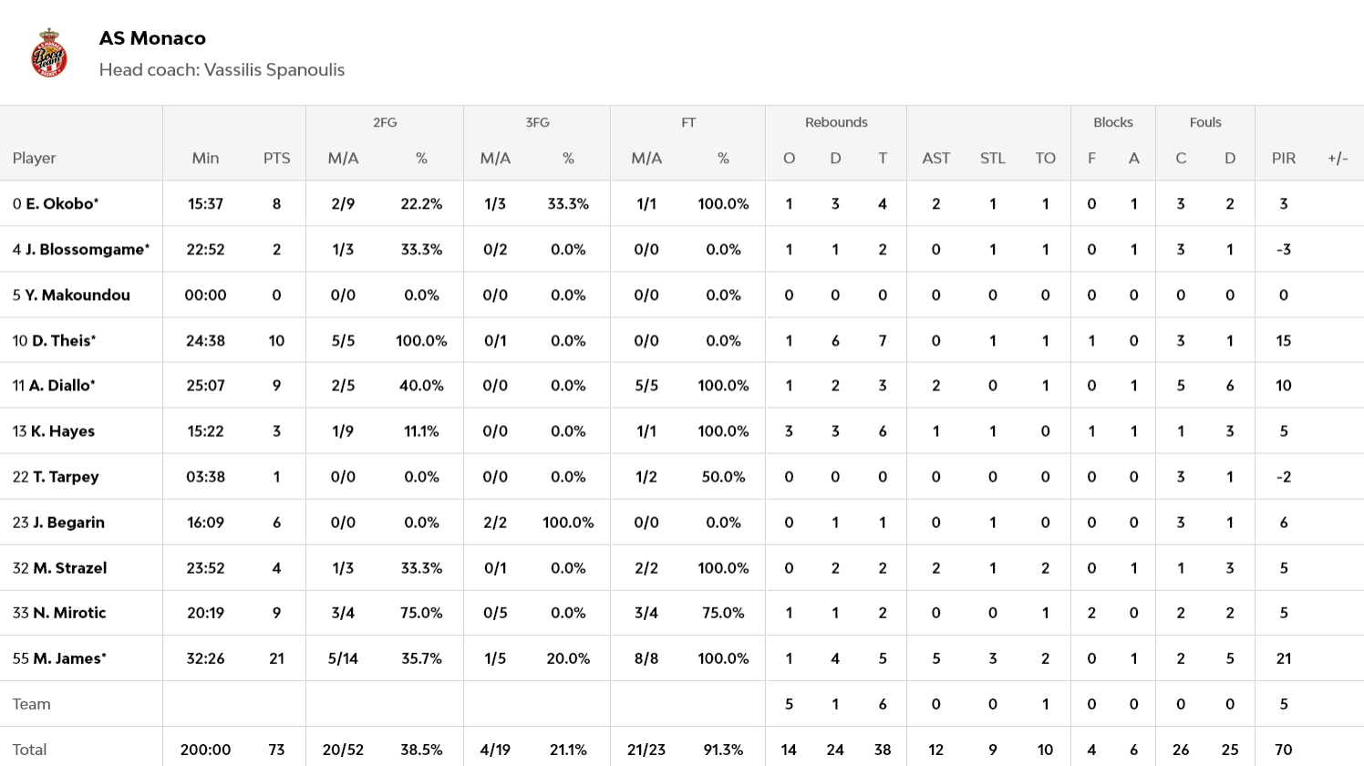 Για την Μονακό, 21 πόντους, πέντε ριμπάουντ, ισάριθμες ασίστ και τρία κλεψίματα, είχε ο Μάικ Τζέιμς, με τον Τάις να προσθέτει 10 πόντους και επτά ριμπάουντ.