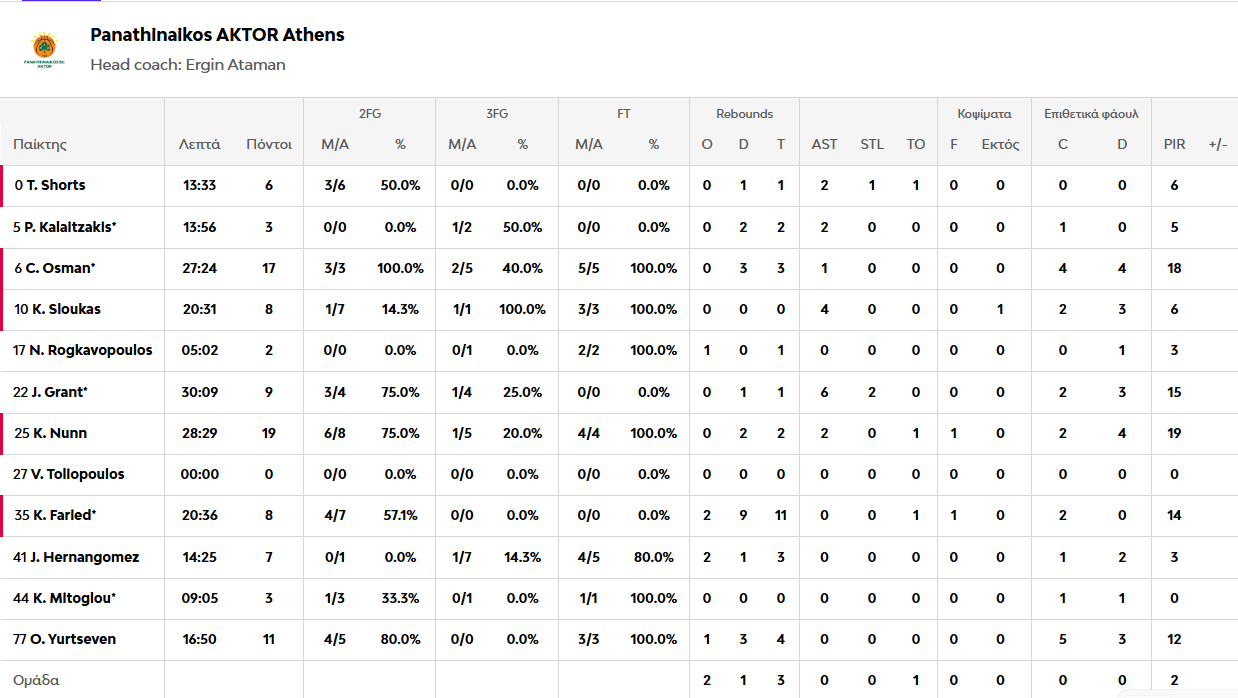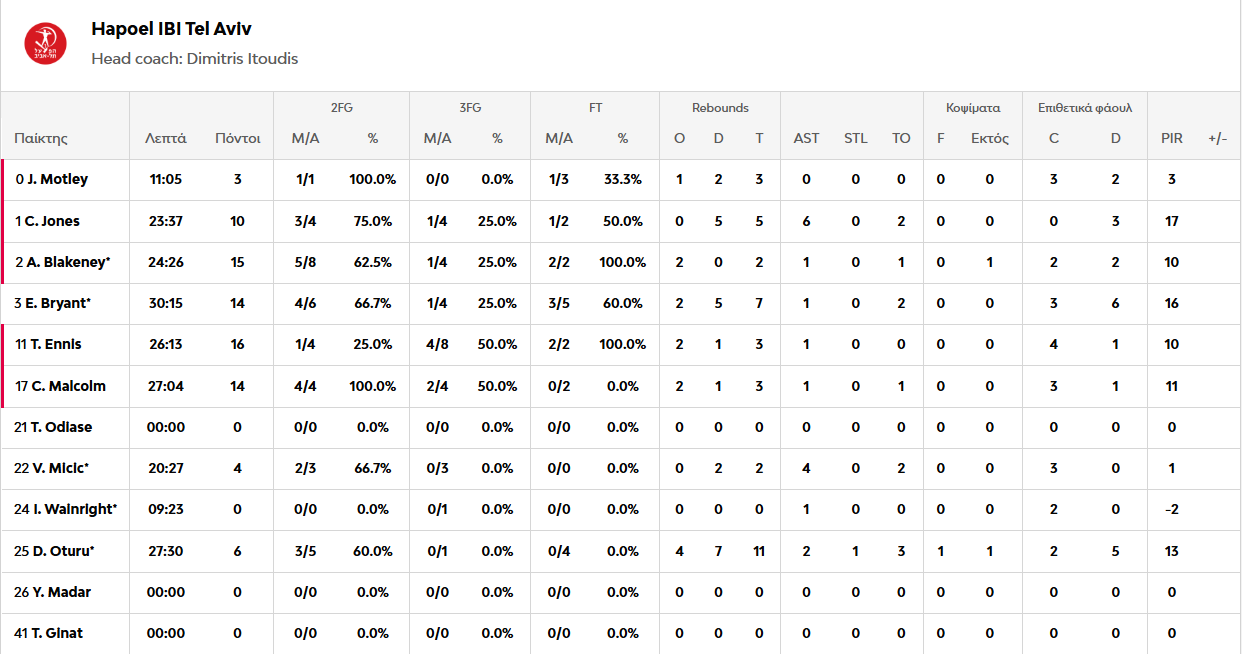 Ξεχώρισαν: Για τους «πράσινους» ο Όσμαν με 17 πόντους (3/3 δίποντα, 2/5 τρίποντα, 5/5 βολές) και 3 ριμπάουντ και ο Φαρίντ με 8 πόντους και 11 ριμπάουντ. Από τους ισραηλινούς, ξεχώρισε ο Ένις με 16 πόντους, ο Μπλακενέι με 15 και ο Μπράιαντ με 14 πόντους και 7 ριμπάουντ.