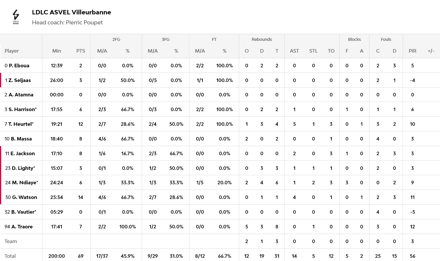 Εξαιρετικός ο Λάιλς με 21 πόντους και επτά ριμπάουντ, με τον Καμπάτσο να έχει 15 πόντους και τον Ταβάρες 12 πόντους και εννιά ριμπάουντ. Για την Βιλερμπάν, που… κατέρρευσε στην τελευταία περίοδο, Γουάτσον και Ερτέλ είχαν 14 και 12 πόντους αντίστοιχα.