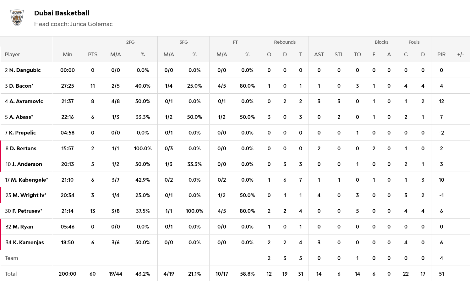 Σπουδαία εμφάνιση από τον Μπλέικνι, με 25 πόντους και επτά ριμπάουντ, με τον Μίτσιτς να πετυχαίνει 19 πόντους, στην επιστροφή του στην δράση, ενώ για την Ντουμπάι, ο Πετρούσεβ είχε 13 πόντους και ο Μπέικον 11.