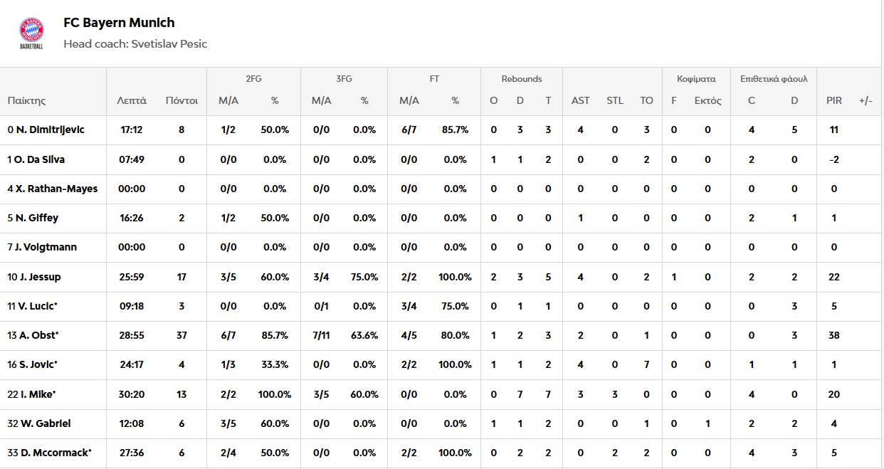 Κορυφαίος της Μπάγερν ήταν ο Ομπστ με 37 πόντους και 7/11 τρίποντα και ο Ζεσούπ με 17 πόντους και 5 ριμπάουντ. Από την Μπασκόνια, ξεχώρισε ο Σπανιόλο με 20 πόντους και ο Κούρουκς με 13 πόντους, 7 ριμπάουντ και 3/4 τρίποντα.