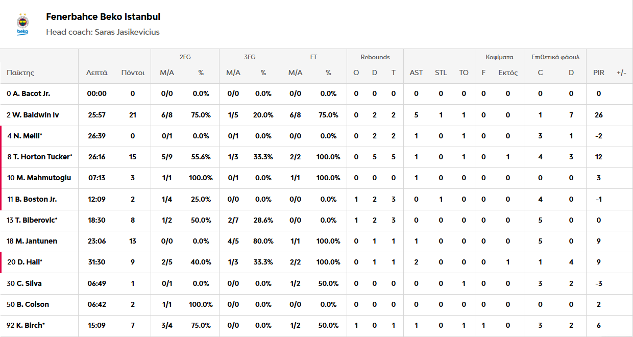 Κορυφαίος της αναμέτρησης και των γηπεδούχων ήταν ο Καμένιας με 20 πόντους και 15 ριμπάουντ, με τον ΜακΚίνλει Ράιτ να τον ακολουθεί με 22 πόντους και 4 ασίστ. Από πλευράς Φενέρ, ξεχώρισε ο Μπόλντγουιν με 21 πόντους και 5 ασίστ και ο Χόρτον-Τάκερ με 15 πόντους και 5 ριμπάουντ.