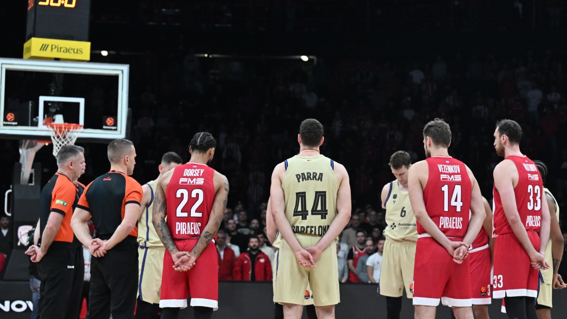 Ενός λεπτού σιγή για τους φιλάθλους του ΠΑΟΚ τηρήθηκε πριν την έναρξη του αγώνα του Ολυμπιακού απέναντι στη Μπαρτσελόνα στο ΣΕΦ.