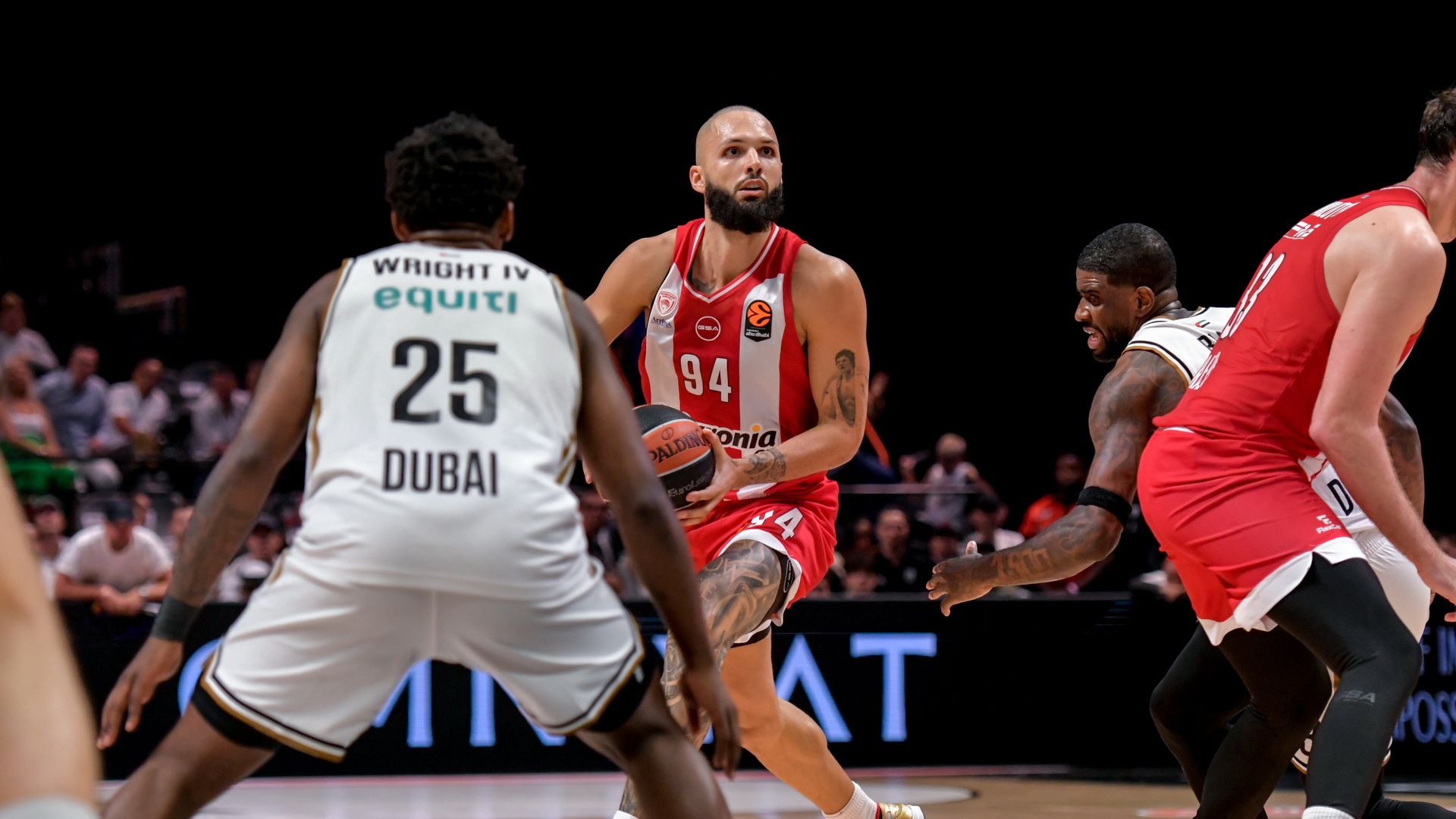 Ο Ράιτ που με δικούς του πόντους έδωσε προβάδισμα στο Ντουμπάι, στην συνέχεια έκανε φάουλ για τρεις βολές στον Ντόρσεϊ, ο οποίος ευστόχησε σε δύο από αυτές και έφερε τους φιλοξενούμενους στο 93-92. Οι γηπεδούχοι αστόχησαν στην επίθεση, οι «ερυθρόλευκοι» είχαν την τύχη του αγώνα στα χέρια τους, ο Ντόρσεϊ αστόχησε σε σουτ τριών πόντων, ο Γουόκαπ πήρε το επιθετικό ριμπάουντ αλλά στην συνέχεια αστόχησε και ο Φουρνιέ, με τον Καμπενγκέλε να κερδίζει και να ευστοχεί σε δύο βολές και να φέρνει το ματς στο 95-92, με το χρονόμετρο να δείχνει 3.3 δευτερόλεπτα. Ο Γουόκαπ επανέφερε, ο Εβάν Φουρνιέ με μια προσποίηση «ξεφορτώθηκε» τον Άντερσον και ευστόχησε σε σουτ τριών πόντων, πηγαίνοντας το ματς στην παράταση.