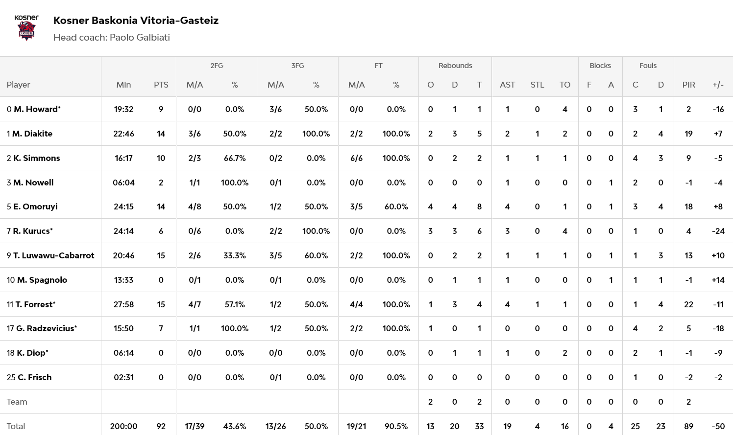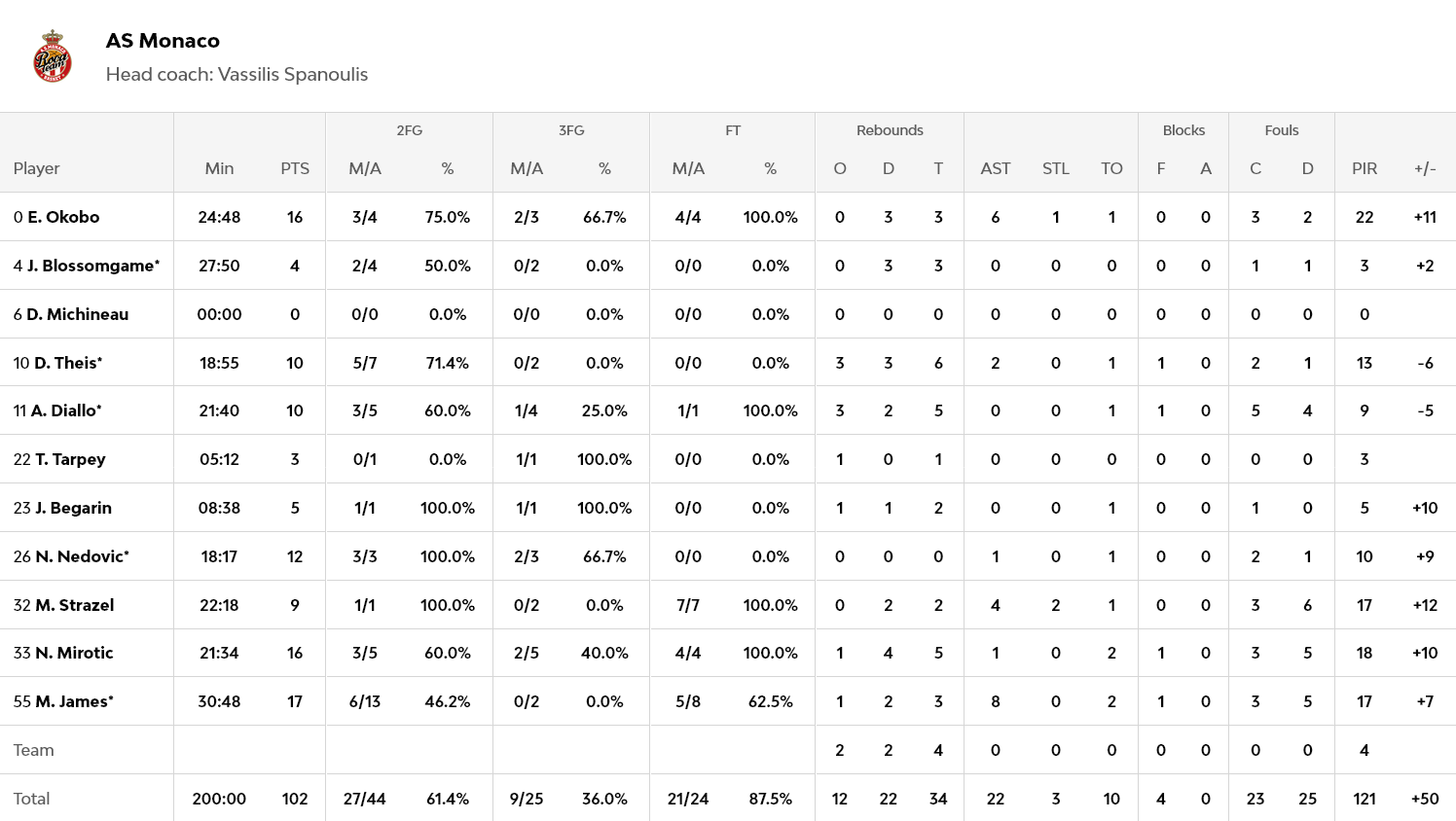 Από την Μονακό διακρίθηκε ο Τζέιμς με 17 πόντους, ενώ οι Μιροτιτς και Οκομπο έβαλαν από 16 πόντους έκαστος. Από την Μπασκόνια ξεχωρισαν οι Φορεστ και Λουβαβου Καμπαρο με 15 πόντους έκαστος.