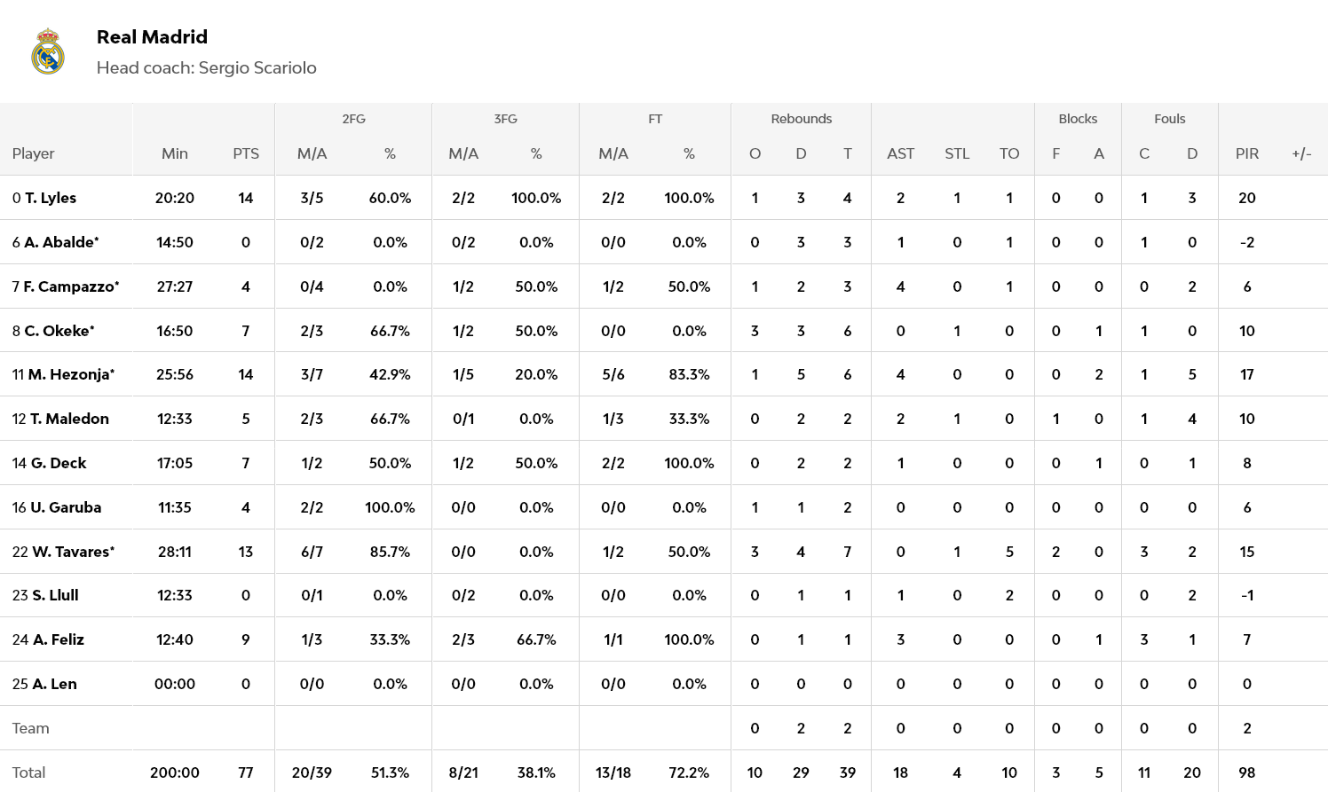 Από την Ρεάλ Μαδρίτης διακρίθηκαν οι Χεζονια και Λάιλς με 14 πόντους έκαστος. Από την Παρτιζάν ξεχώρισαν οι Μπράουν και Γουάσινγκτον με 14 και 13 πόντους αντίστοιχα.