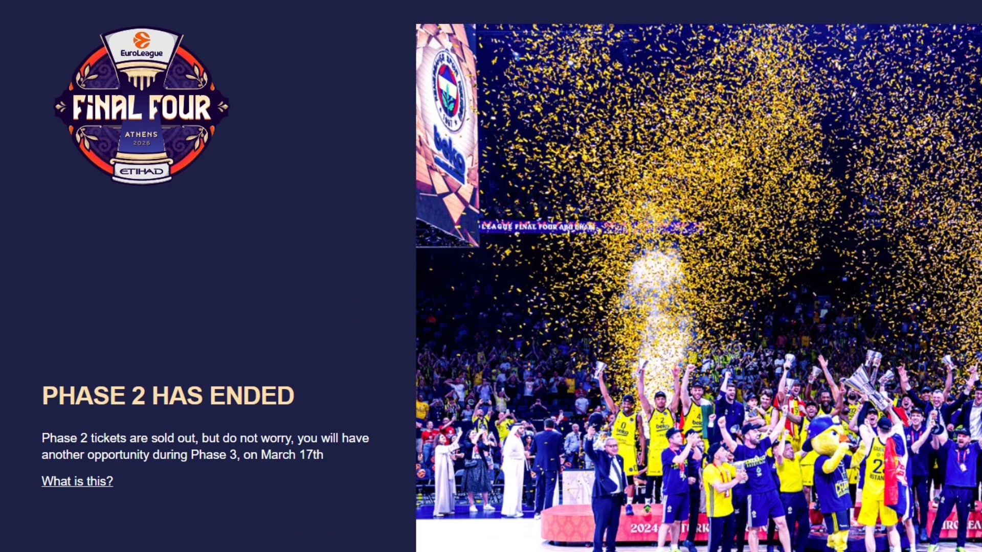 Το πρωί της Πέμπτης (26/2) ξεκίνησε η δεύτερη φάση πώλησης εισιτηρίων για το Final Four της Αθήνας, τα οποία εξαφανίστηκαν σε μόλις λίγα λεπτά!