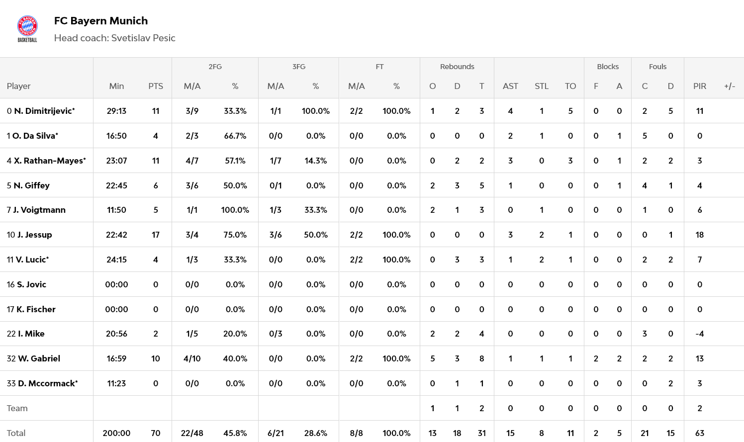 Από την Ρεάλ ξεχώρισαν οι Χεζόνια και Λάιλς από 16 και 12 πόντους αντίστοιχα. Από την Μπάγερν έβαλε ο Γιεσάπ από 17 πόντους, ενώ οι Ντιμιτρίγιεβιτς και Ράταν Μέις σκόραραν από έντεκα πόντους έκαστος.