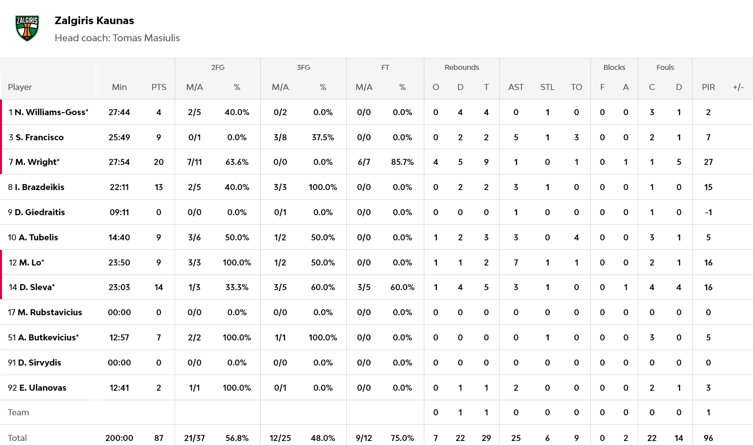 Για την Ζαλγκίρις, εξαιρετικός για ακόμα ένα ματς, ήταν ο Μόουζες Ράιτ, με 20 πόντους και εννέα ριμπάουντ, με τον Σλέβα να έχει 14 πόντους, ενώ πολύ καλός ήταν και ο Μπραζντέικις με 13 πόντους και 3/3 τρίποντα.