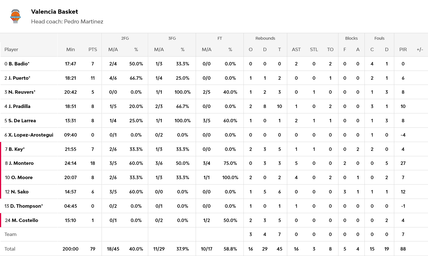 Ο Χεζόνια με 16 πόντους ήταν ο πρώτος σκόρερ της Ρεάλ, με τον Ντεκ να προσθέτει 14 και τον Λάιλς 12. Για την Βαλένθια, Μοντέρο και Πουέρτο είχαν 18 και 11 πόντους αντίστοιχα.