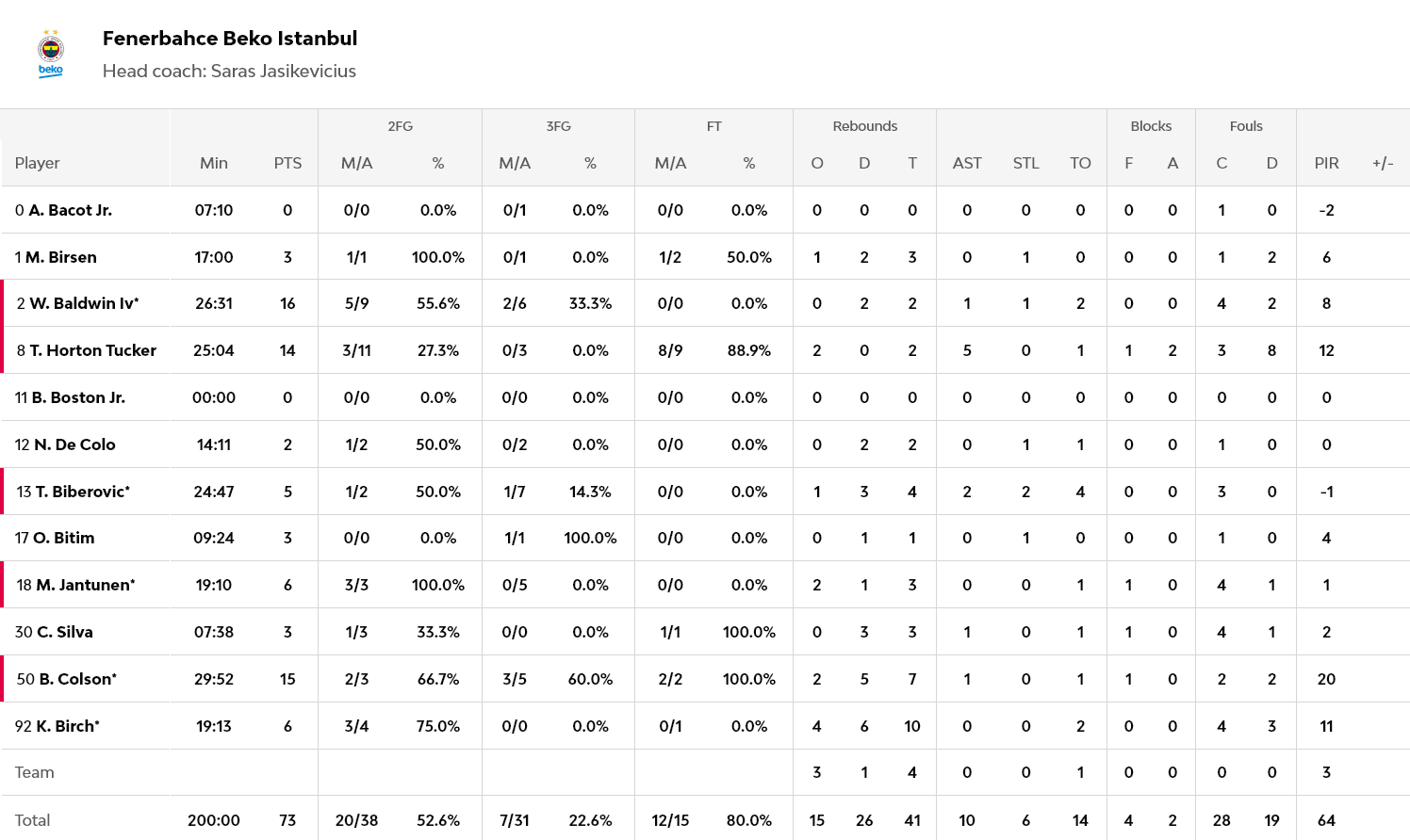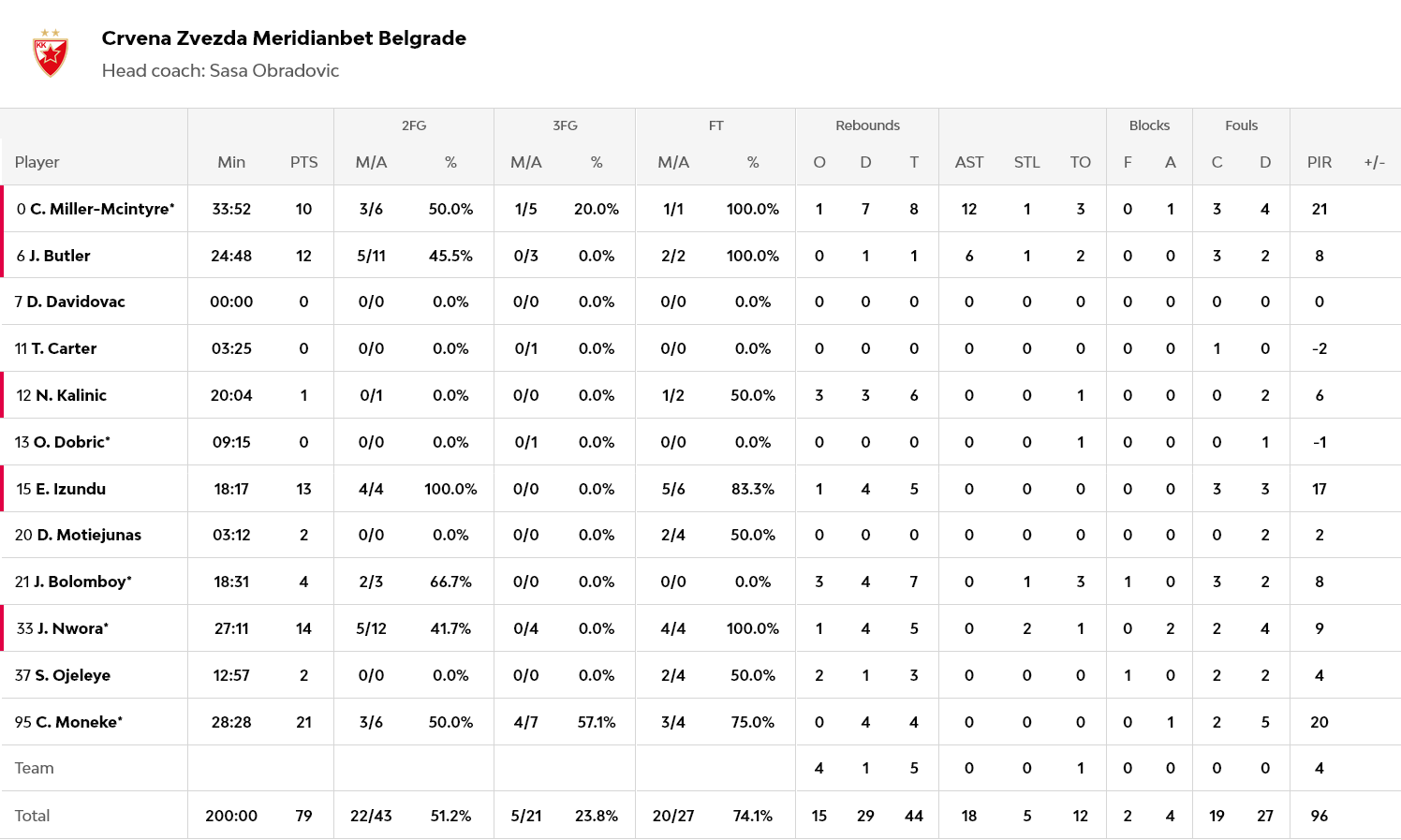 Από τον Ερυθρό Αστέρα διακρίθηκαν οι Μονέκε και Νουόρα με 21 και 14 πόντους αντίστοιχα. Από την Φενέρμπαχτσε έβαλαν οι Μπάλντουιν και Κόλσον με 16 και 15 πόντους.