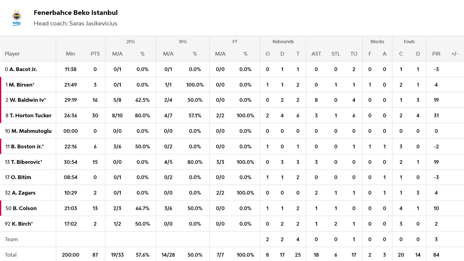 Ξεχώρισαν: Μεγάλη εμφάνιση από τον Σάσα Βεζένκοβ με 24 πόντους και το απίστευτο 10/11 δίποντα, ενώ 10 πόντους σημείωσε ο Ντόρσεϊ. Για την Φενέρ, ο Τάιλεν Χόρτον – Τάκερ ήταν εκπληκτικός με 30 πόντους, έχοντας 8/10 δίποντα και 4/7 τρίποντα, αλλά και έξι ριμπάουντ. 16 πόντους με οκτώ ασίστ είχε ο Μπάλντγουιν και 15 πόντους με 4/5 τρίποντα ο Μπιμπέροβιτς.