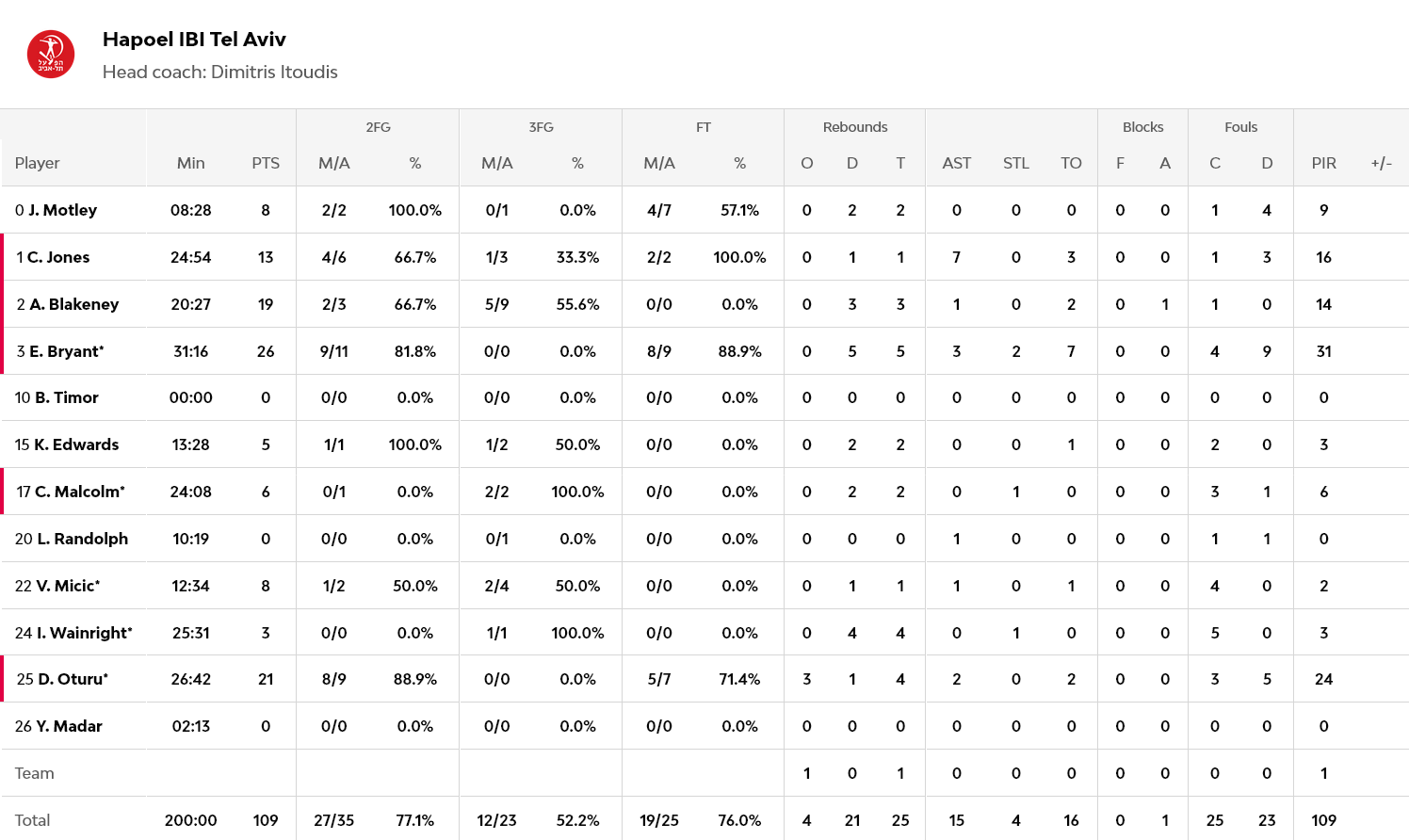 Ούτε έναν, ούτε δύο, αλλά επτά (!) παίκτες με διψήφιο αριθμό πόντων, είχε η Μπασκόνια, με τον Φόρεστ να έχει 22, τον Ντιακιτέ 15 και τον Σίμονς 14. Για την Χάποελ, 26 πόντους πέτυχε ο Μπράιαντ και 21 ο Οτούρου, ενώ ο Μπλέικνι σταμάτησε στους 19 πόντους.