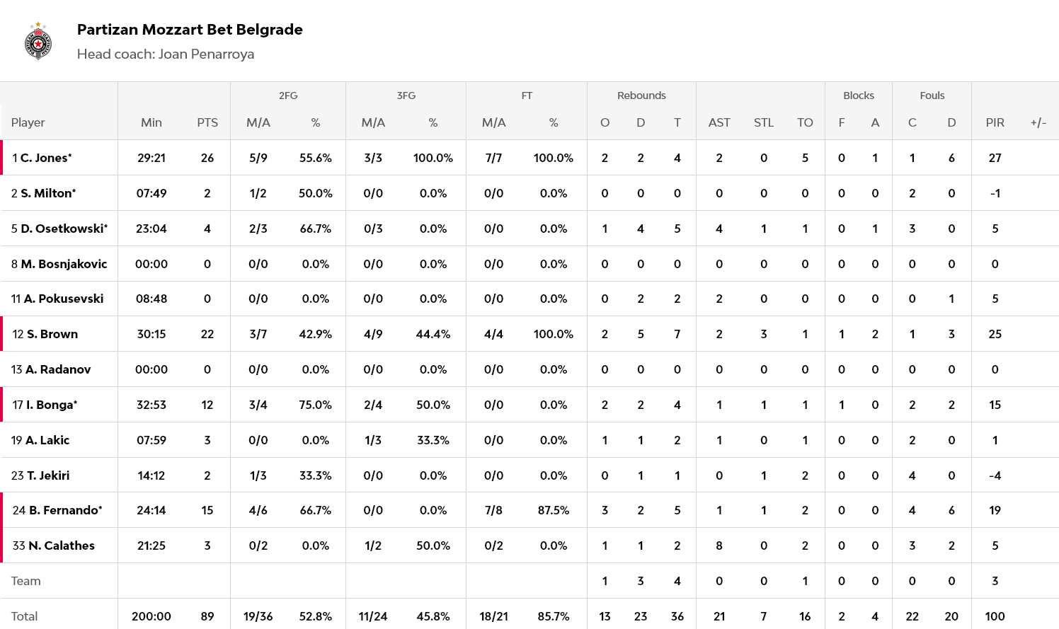 Απίστευτο γλέντι της Παρτιζάν μέσα στην «Μπεογκράτσκα Αρίνα», με τους «ασπρόμαυρους», χάρη σε έναν απολαυστικό Κάρλικ Τζόουνς, να ρίχνουν στο… καναβάτσο τον Ερυθρό Αστέρα με 89-82, «τορπιλίζοντας», ουσιαστικά, τις ελπίδες του άσπονδου συμπολίτη για την πρώτη εξάδα και την απευθείας πρόκριση στα Play Offs.