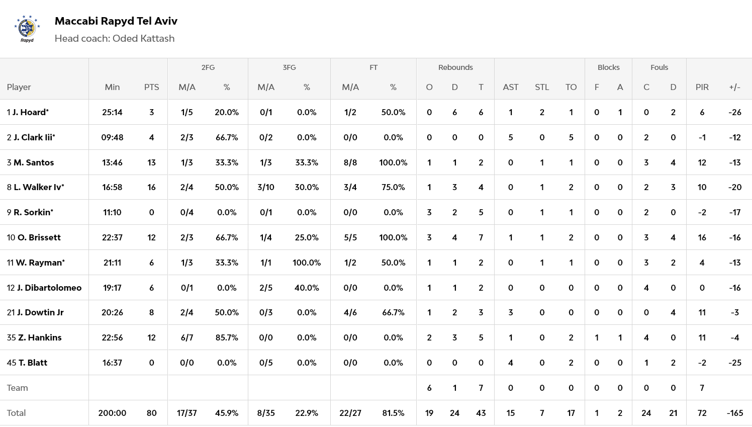 Από το… ναυάγιο της Μακάμπι, η οποία έπεσε στο 18-18, οι μόνοι που κάτι έκαναν, ήταν ο Γουόκερ με 16 πόντους και ο Μπριστέτ με 12 πόντους και επτά ριμπάουντ.