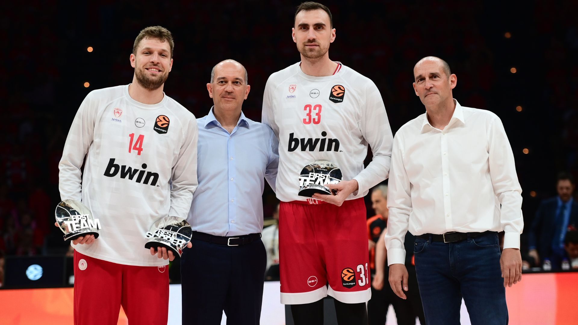 Οι ισχυροί άνδρες της ΚΑΕ Ολυμπιακός, Παναγιώτης και Γιώργος Αγγελόπουλος παρέδωσαν τα βραβεία της καλύτερης πεντάδας σε Σάσα Βεζένκοβ και Νίκολα Μιλουτίνοβ πριν το τζάμπολ του Game 1 κόντρα στη Μονακό.